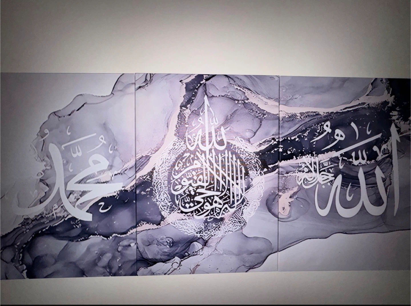 This is a three-panel wall art piece featuring Islamic calligraphy. The design has a marbled effect in shades of grey and white. It's ready to hang as a decorative set.