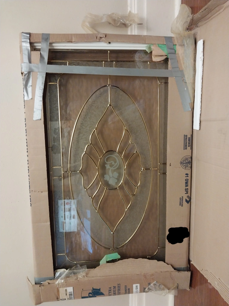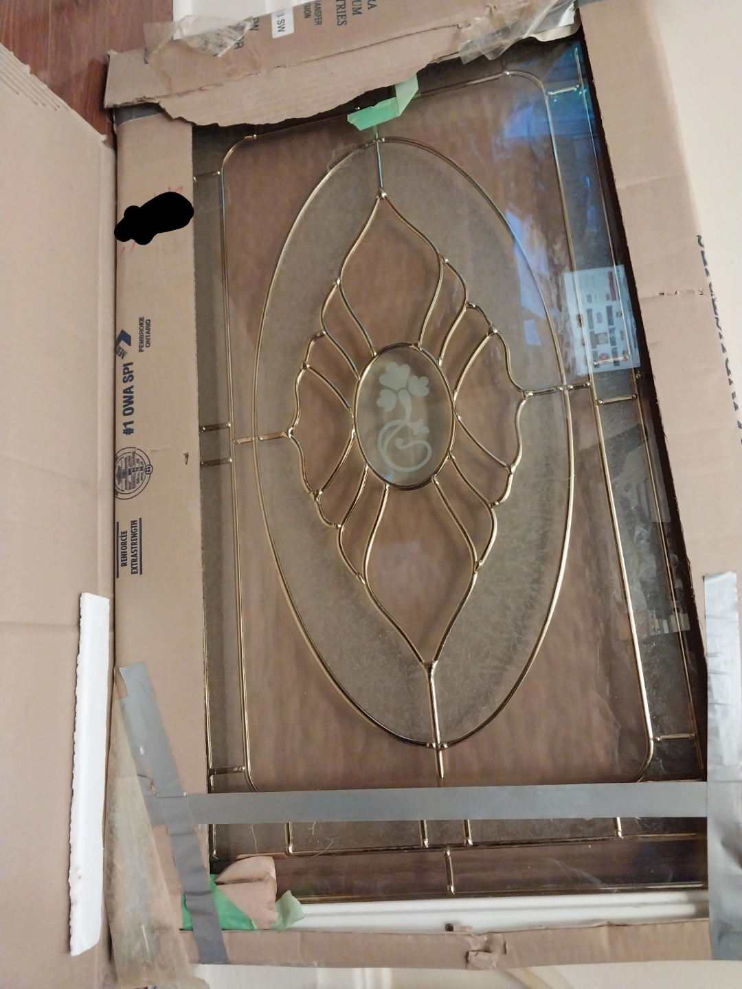 ✅️Glass door panel insert with gold trim. Never installed. In original packaging. Fits a standard door. Superior strength and durability.