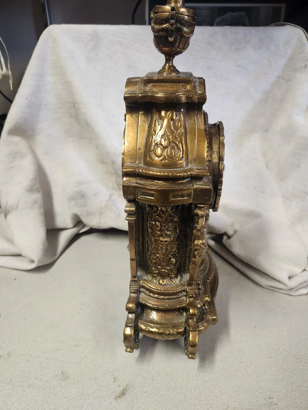 Ornate decorative mantel clock with a brass finish. Features intricate carvings and a classic Roman numeral dial. It's a beautiful accent piece for any room!