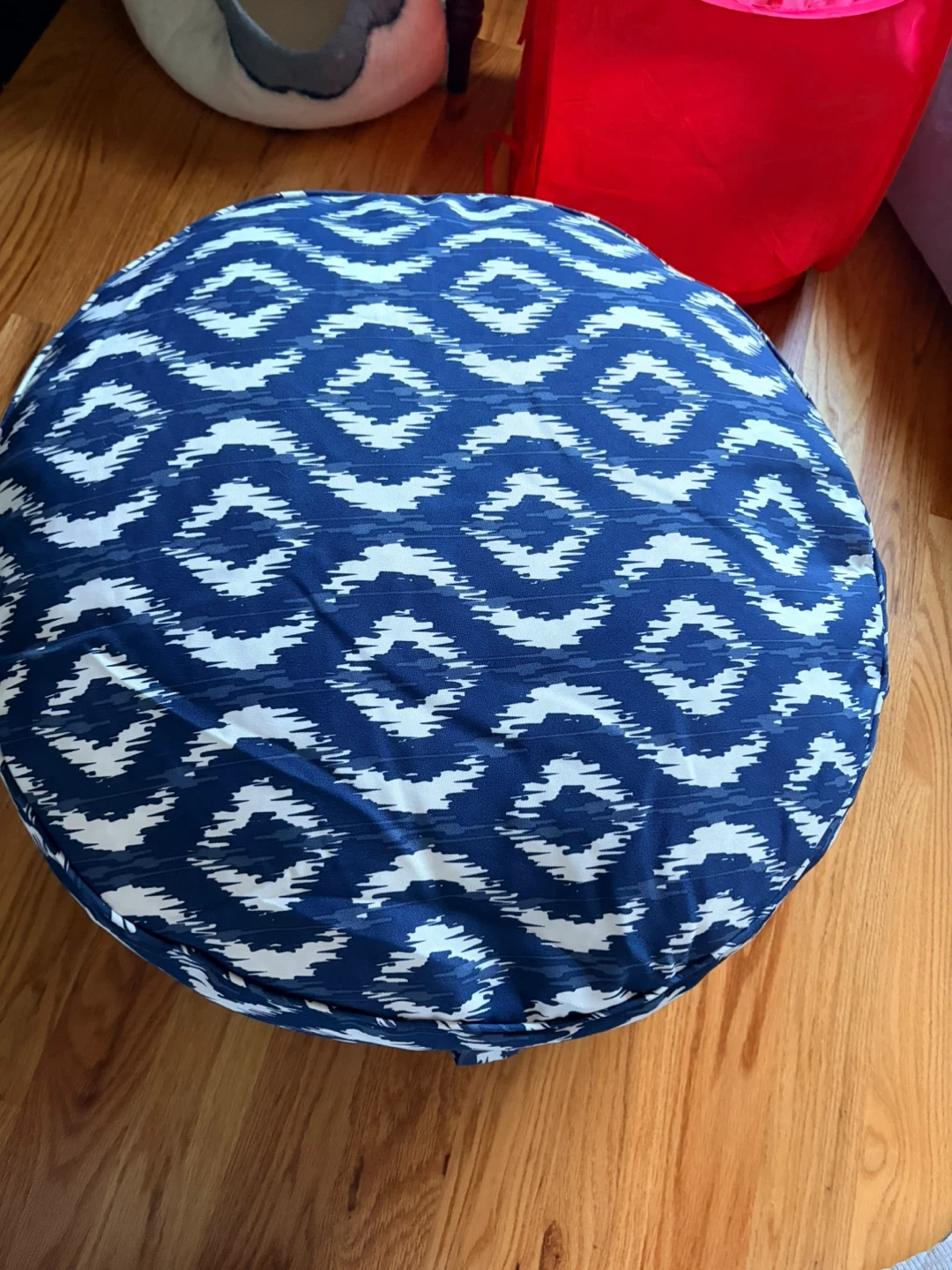 Round Blue and White Ikat Pouf Ottoman