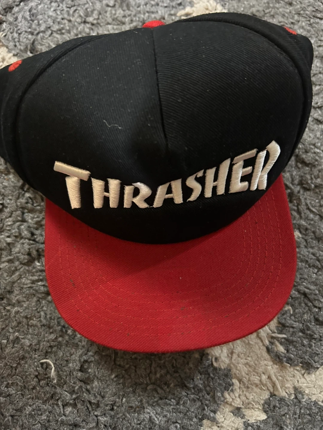 This is a Thrasher snapback hat with a black crown and red brim. It's embroidered with the Thrasher logo in white. This hat's a classic for skate style.