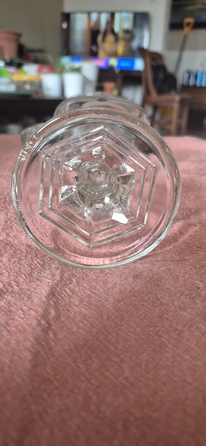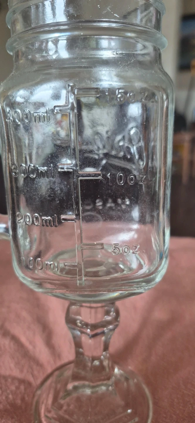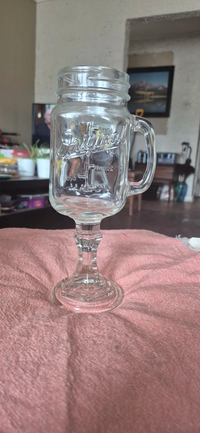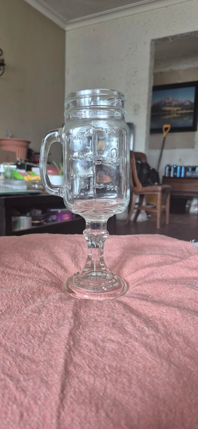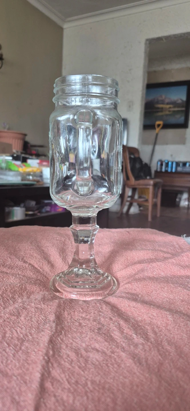 This is an Original Mason jar mug, complete with a handle for easy gripping. It's made of clear glass and has measurement markings on the side. It's a unique way to enjoy your favourite beverages! No chips or cracks. Stem to rim - 9 inches tall. Solid Mugs. These mugs are also call redneck wine mugs or what ever your poison. I have 3 of them at $15.00 each.