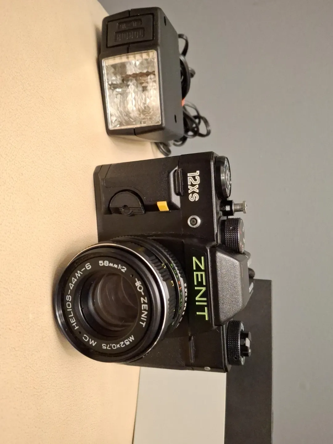 Zenit 12XS 35mm film camera with a Helios-44M-6 58mm f/2 lens. It's a classic mechanical SLR camera. Includes a separate flash unit.