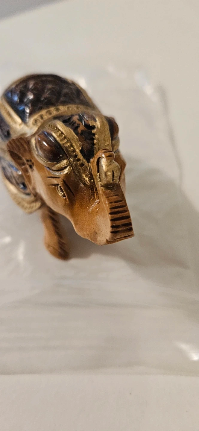 Small size! This is a decorative figurine of an elephant. It features intricate carvings and gold-tone accents. It would make a lovely decorative piece for a shelf or table.