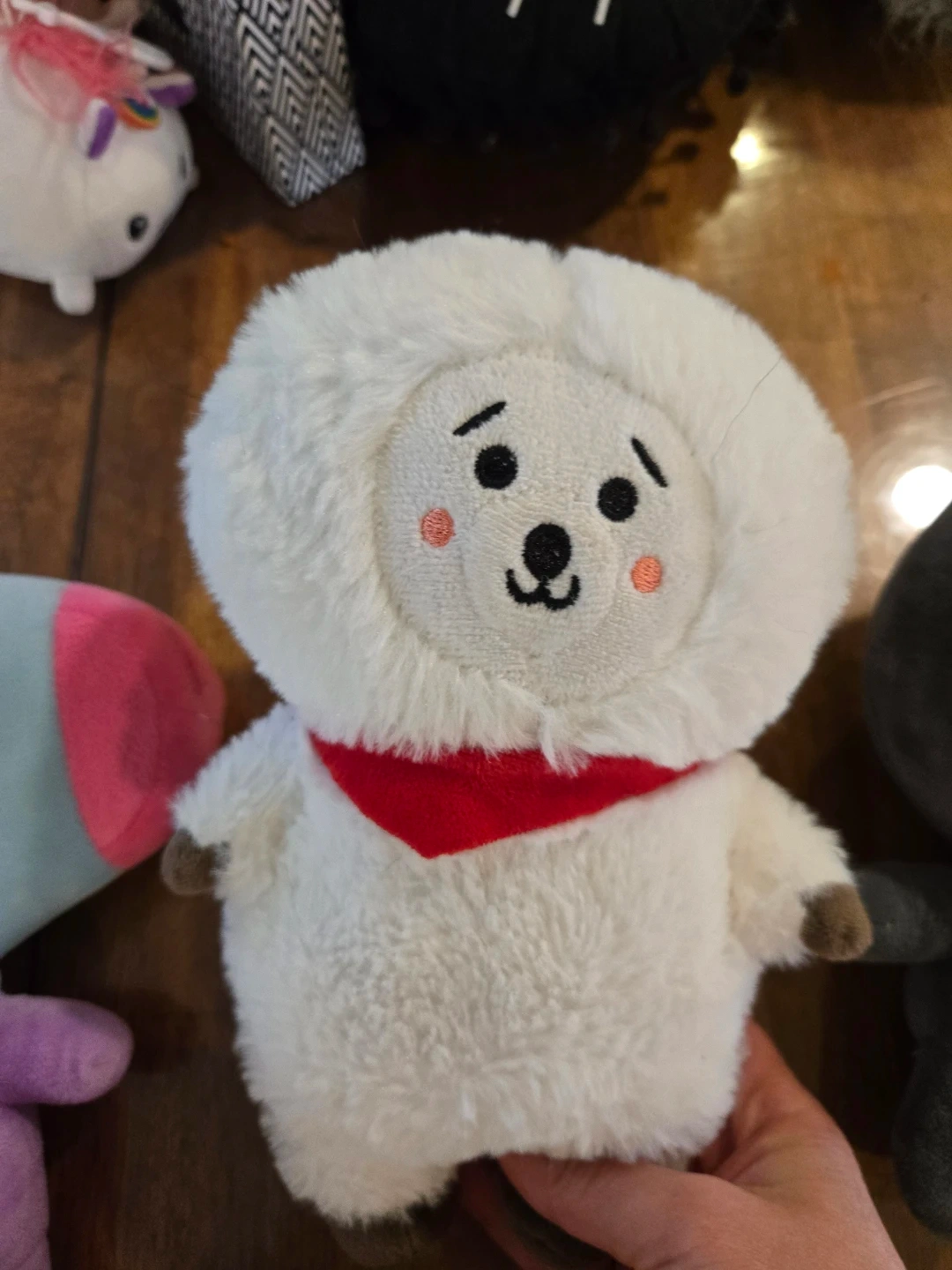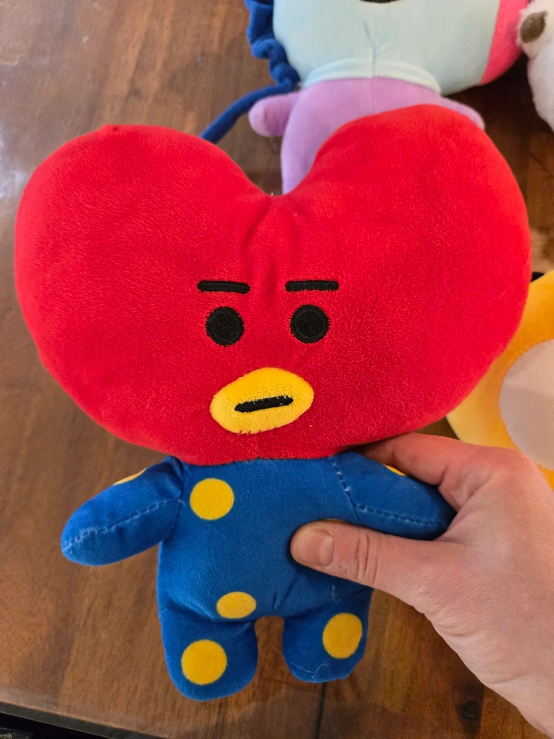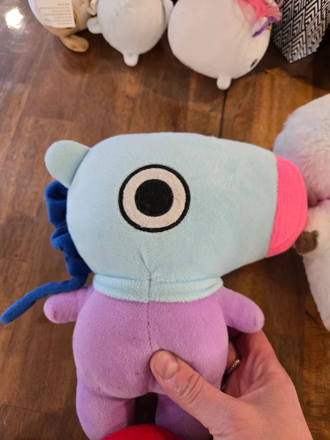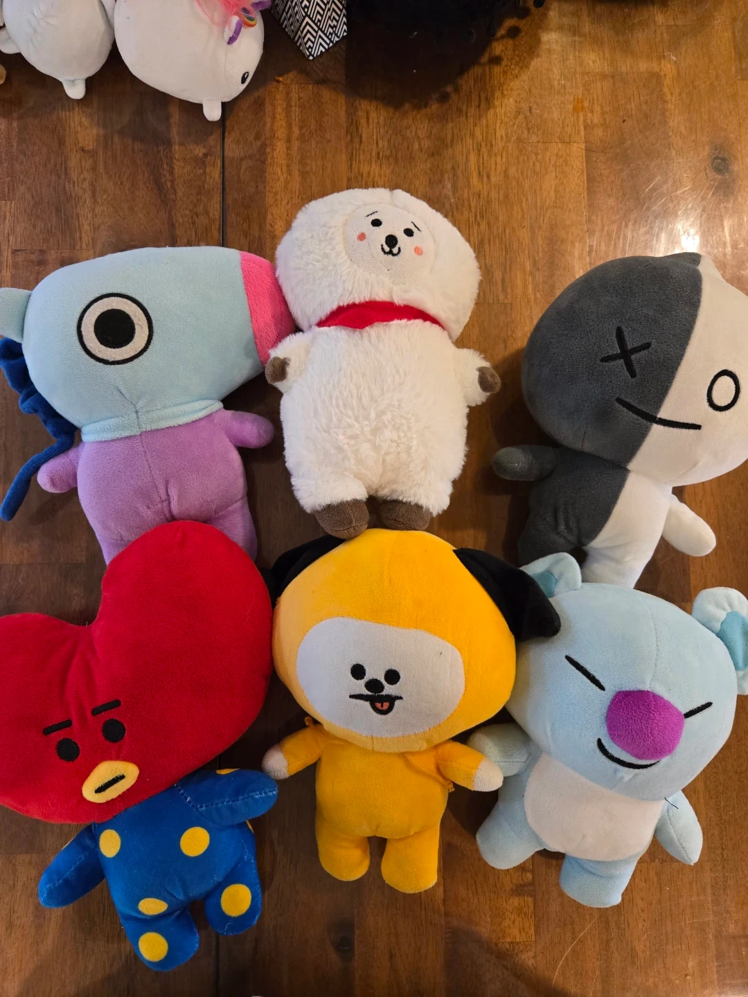 A collection of six BT21 character plush toys. Includes Tata, Chimmy, RJ, Cooky, Shooky, and Mang. Soft and cuddly plush material. These characters are from the popular K-pop group BTS. 45 for all