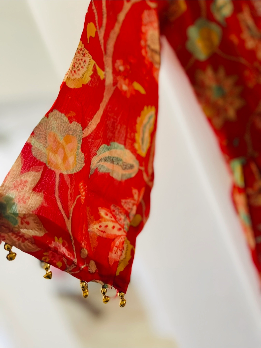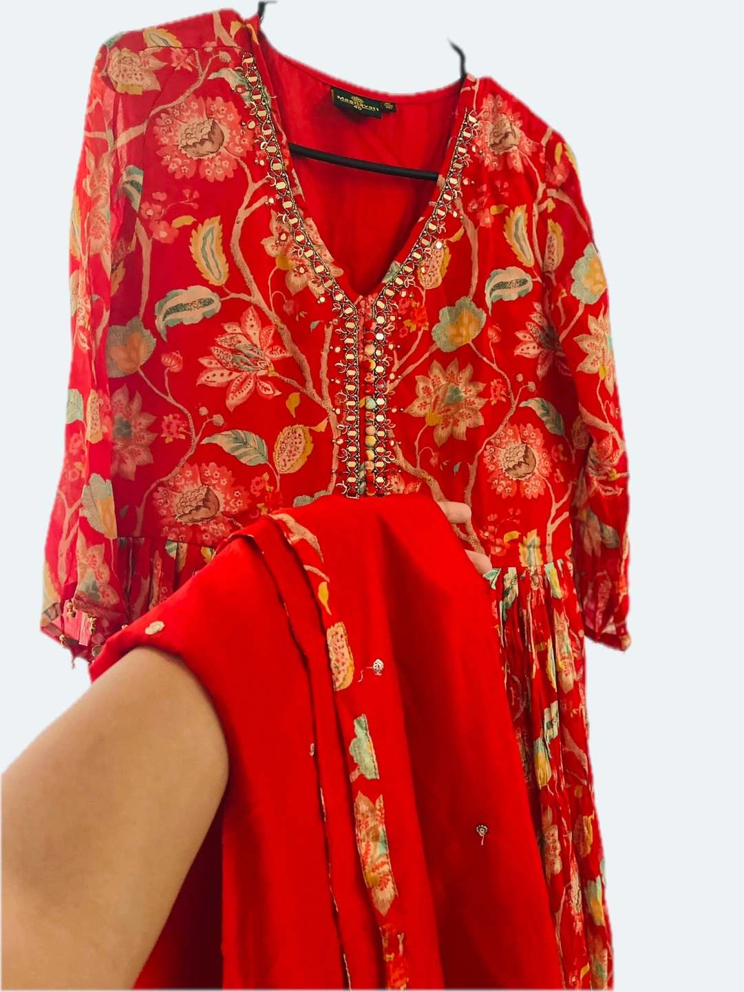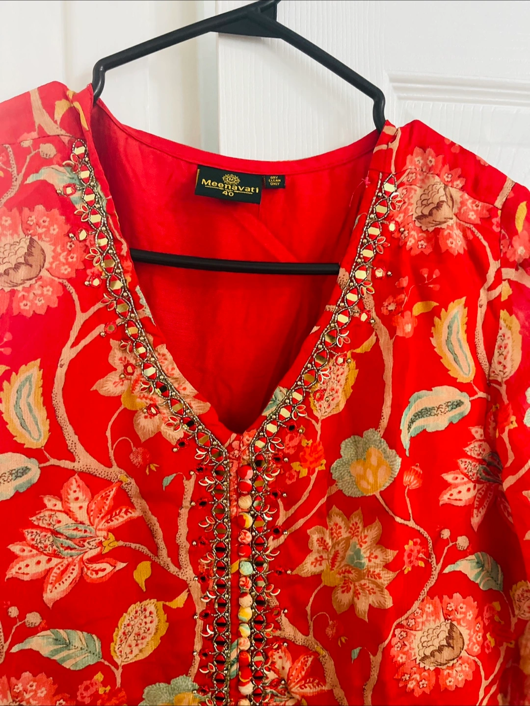 Selling a beautiful Meena Bazaar dress in a vibrant red floral print! The dress is a size 40. It features lovely detailing around the neckline. Perfect for a special occasion or to add a pop of colour to your wardrobe!