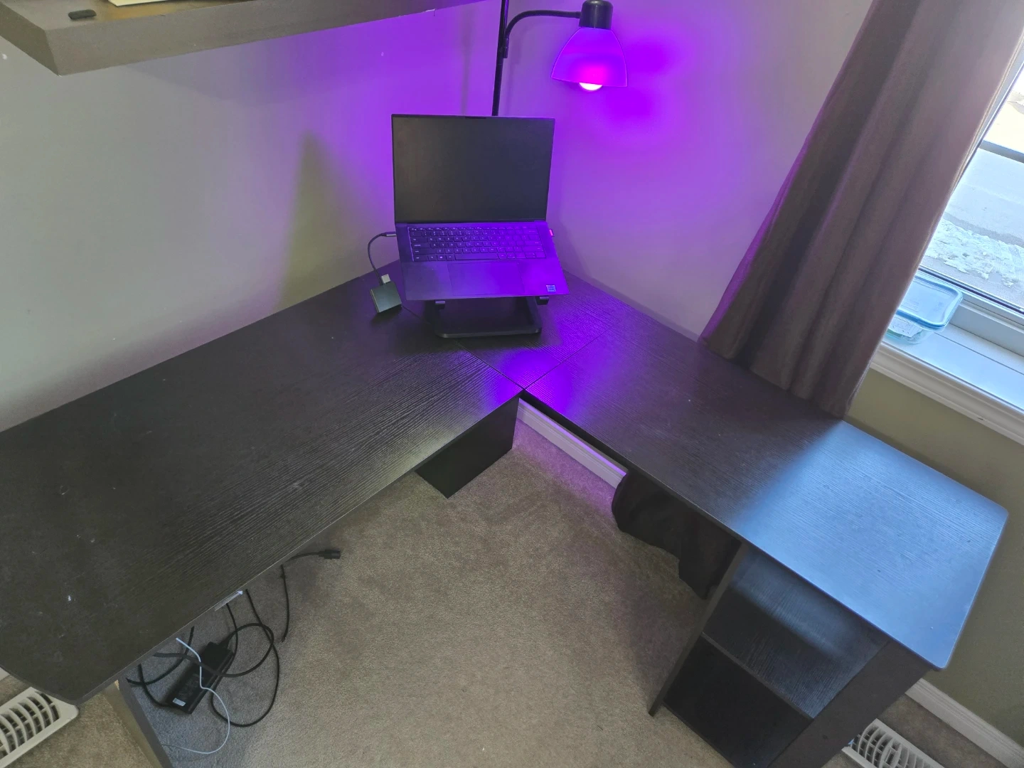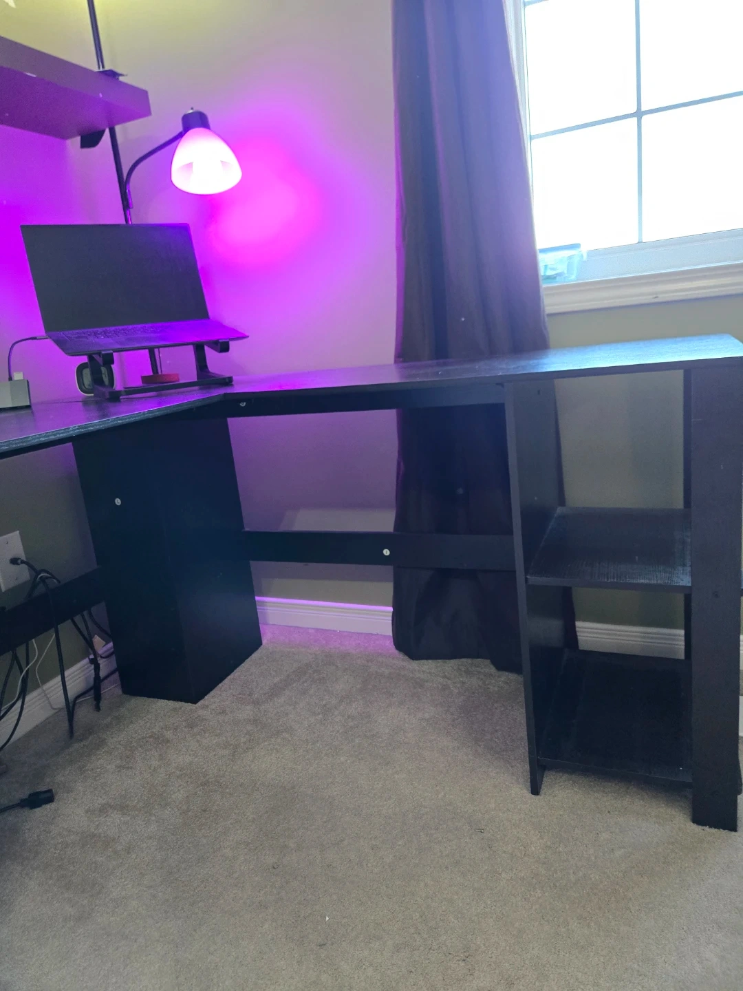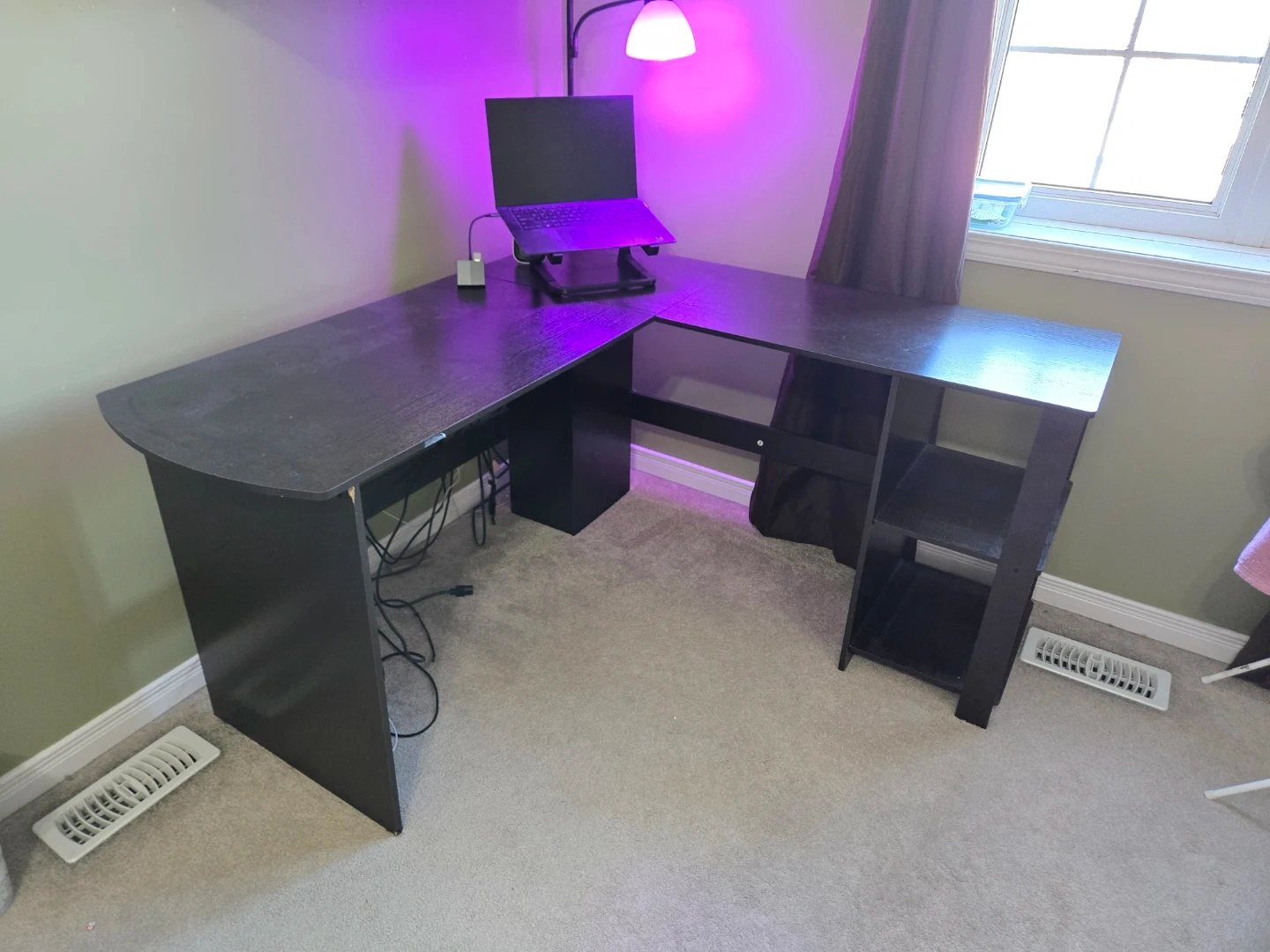 This black L-shaped desk provides ample workspace and fits neatly into a corner. It has a smooth surface and open shelving on one side for storage. It's ideal for setting up a home office or gaming station. Its detachable.