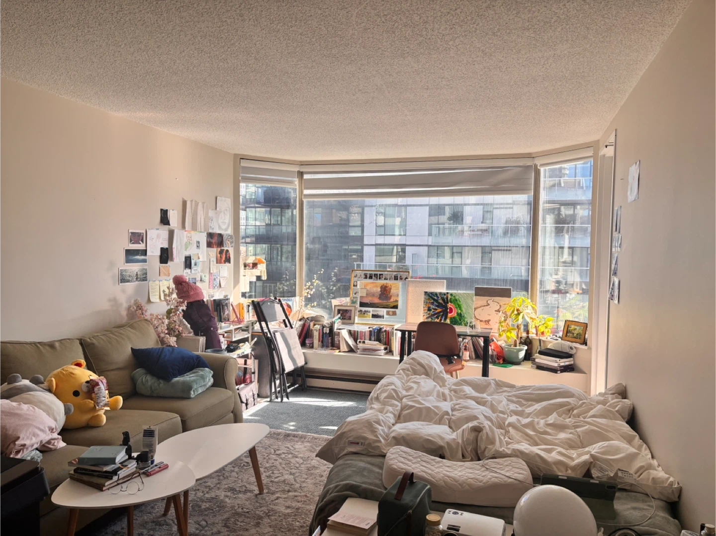 It’s a massive living room with the curtains for your privacy. Single bed, sofa, desk, chair, dining area available. 1 shared bathroom with another girl. It has a nice view and balcony. Shared laundry room and gym. Utility will be split in half(around 70 a month).