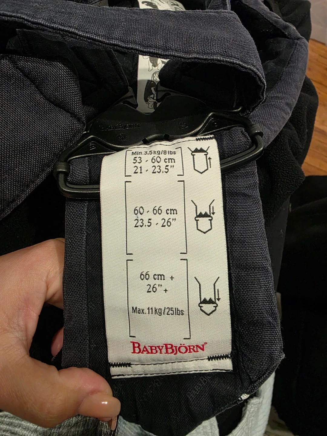 BabyBjörn baby carrier in Blue. Designed for babies from 3.5 kg to 11 kg (8 lbs to 25 lbs). Adjustable straps for a comfortable fit. Used for infants 53-60 cm (21-23.5"), 60-66 cm (23.5-26"), and over 66 cm (26"). Great for hands-free carrying!