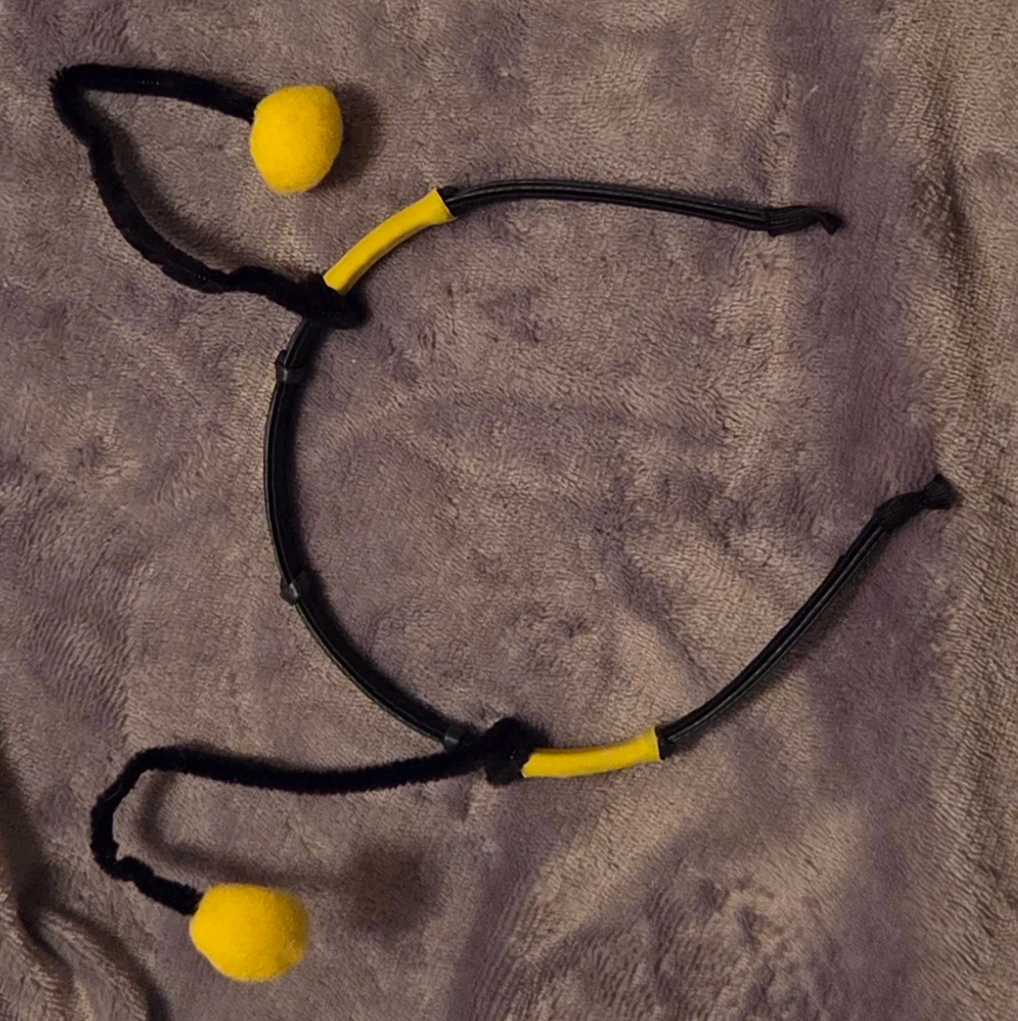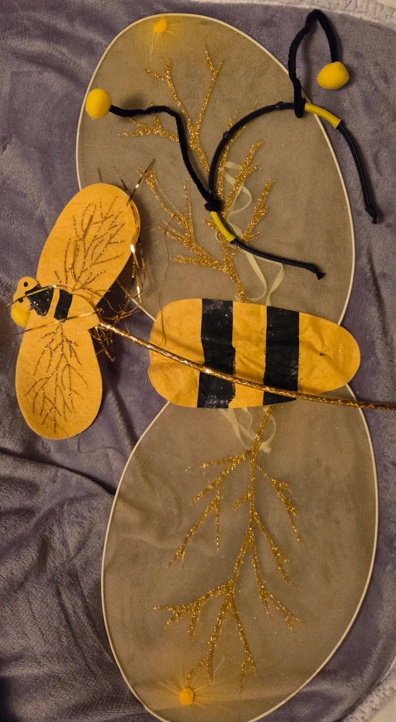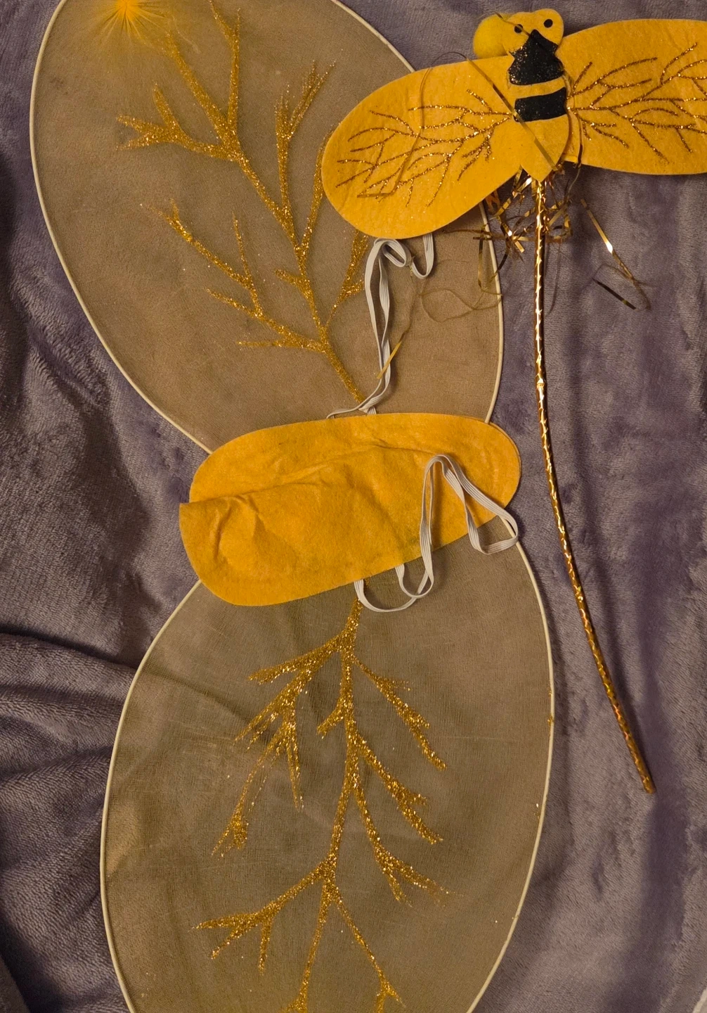 A fun bee costume set including glittery wings, a plush body piece, and antennae headband. Great for dress-up or Halloween! Made from felt and sheer fabric.