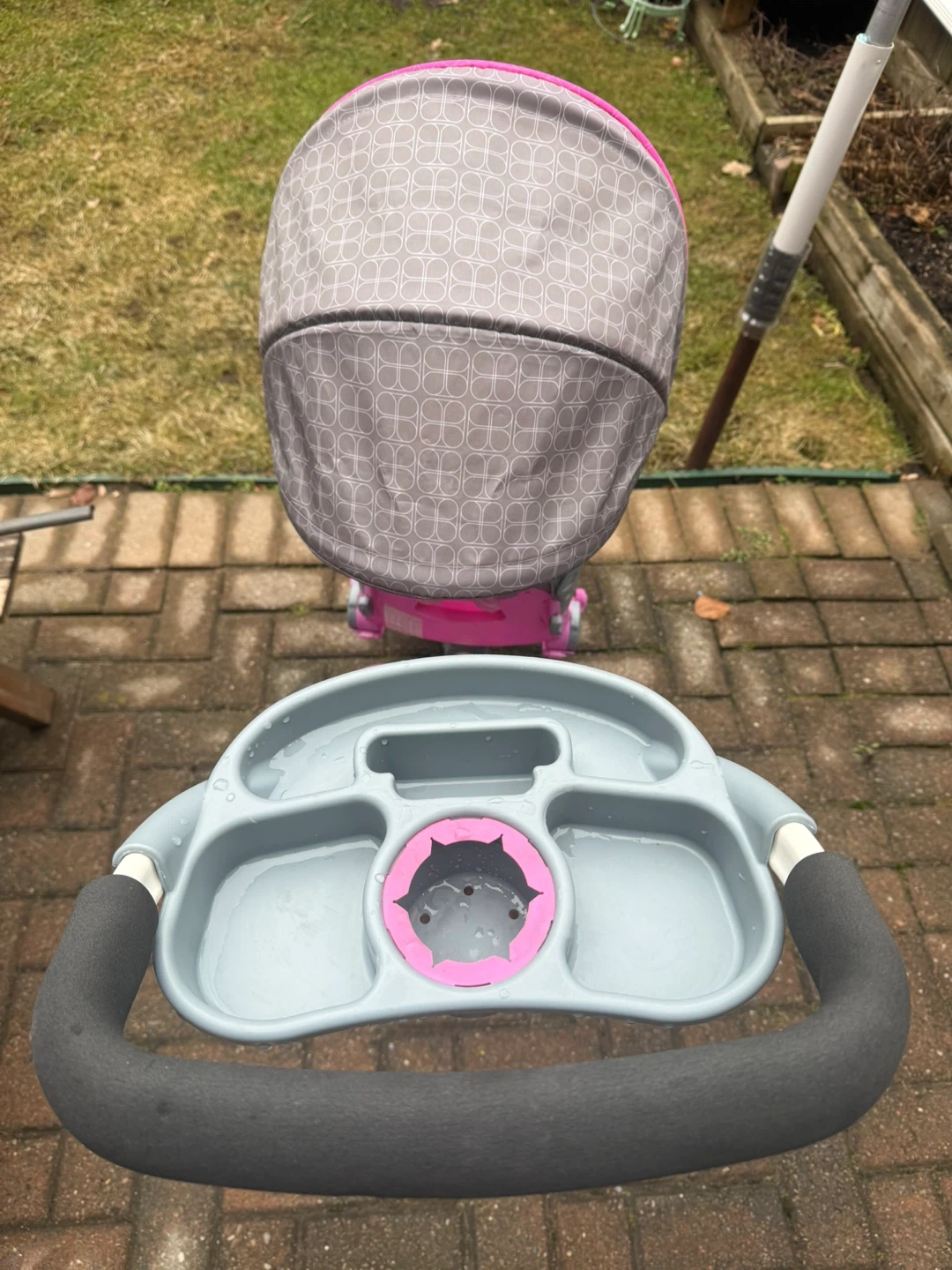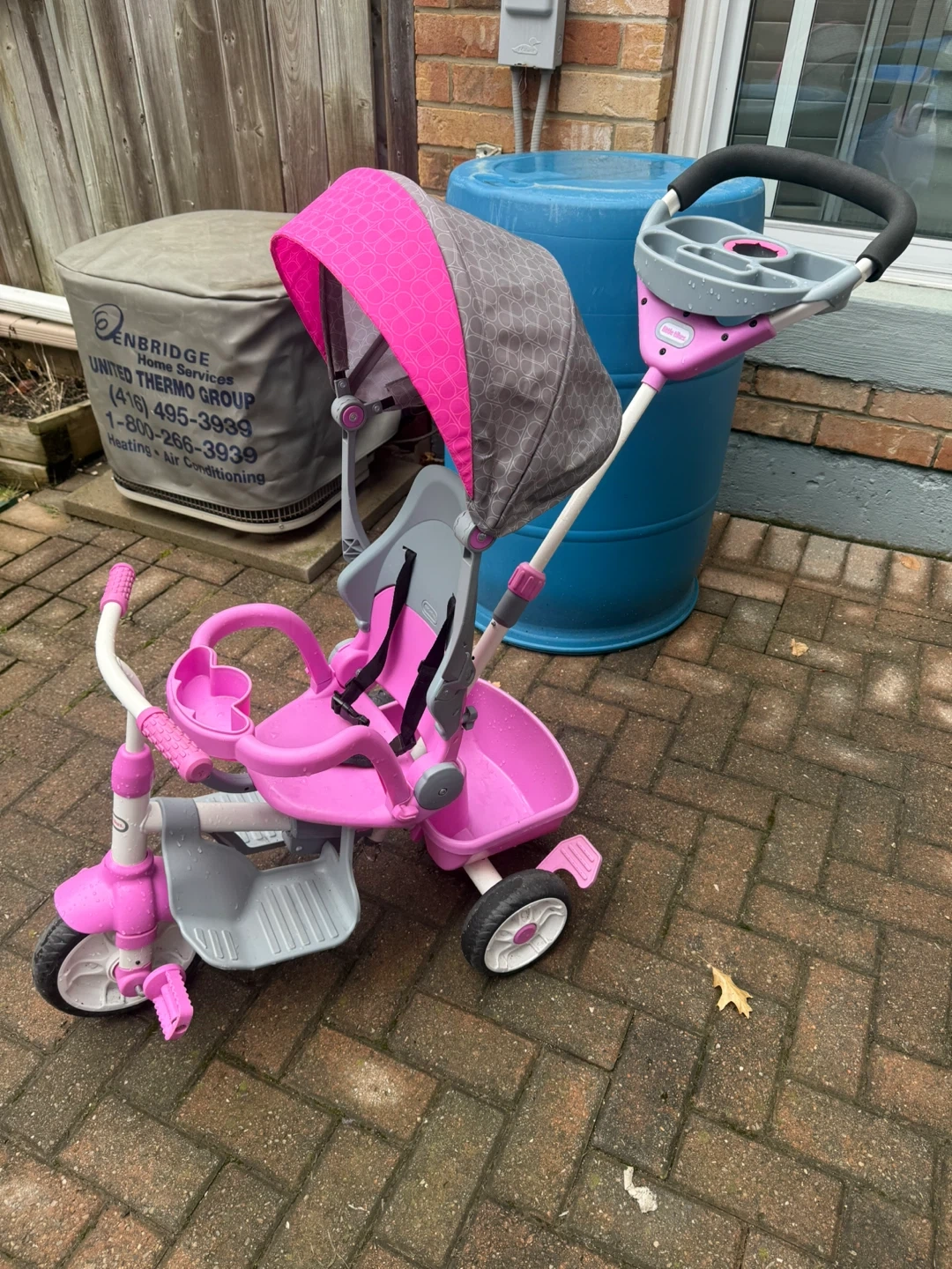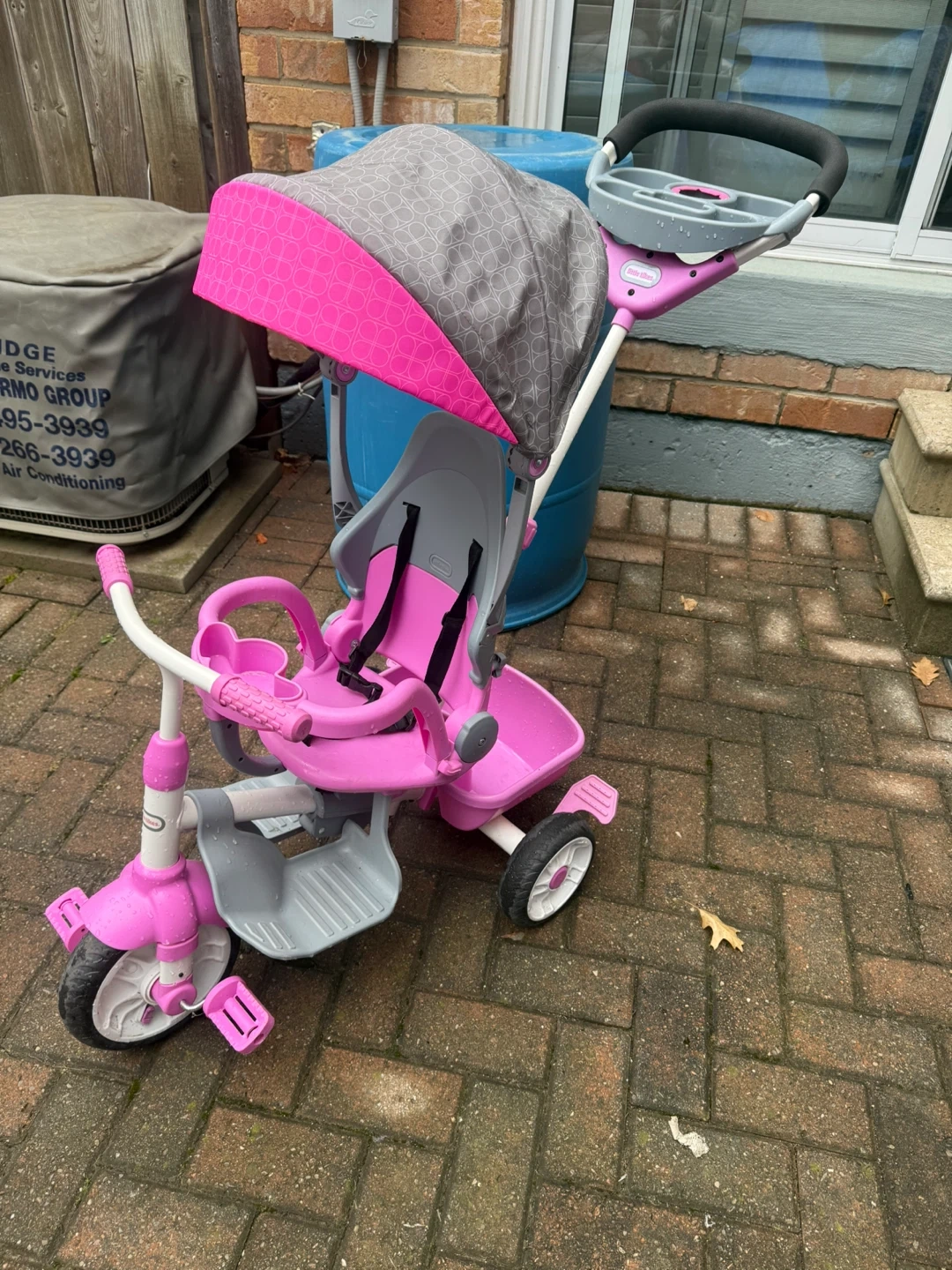 This versatile pink Little Tikes 4-in-1 trike grows with your child, offering multiple stages from stroll to ride. It features a secure safety harness and a convenient parent push handle.