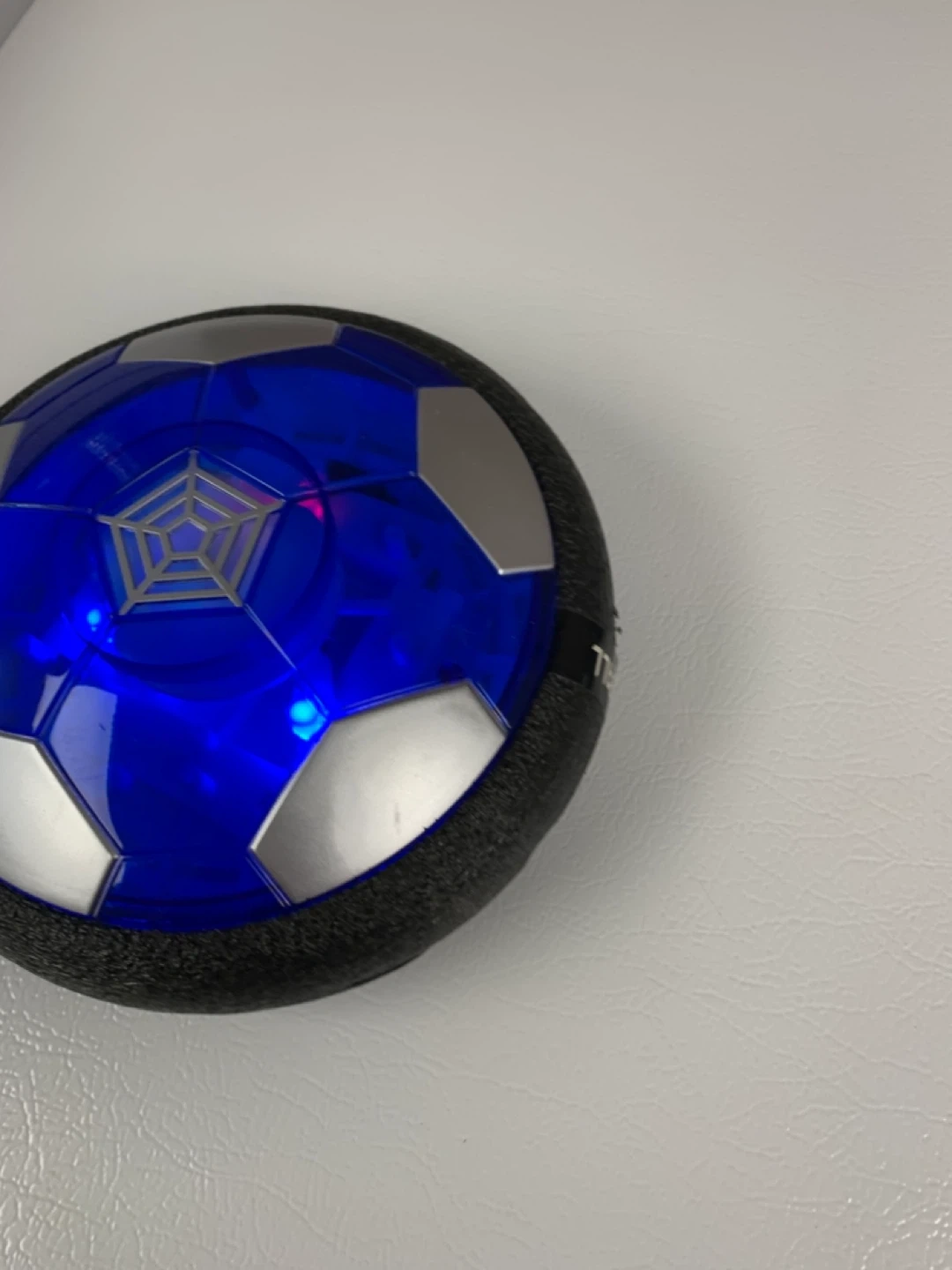 This fun hover soccer ball lights up and glides across surfaces. It's made with a durable plastic and foam bumper for safe play. Great for indoor fun on smooth floors!