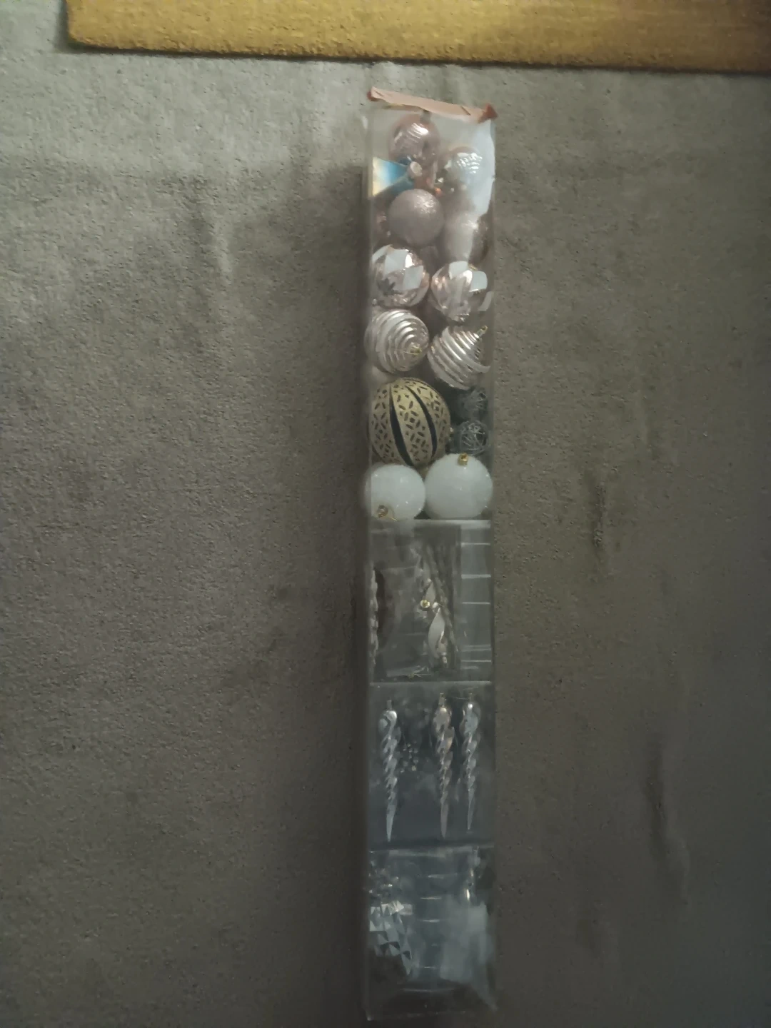 A collection of Christmas ornaments for your tree. Includes various ball and icicle-shaped decorations in metallic and white finishes. Comes in a clear plastic case for storage.