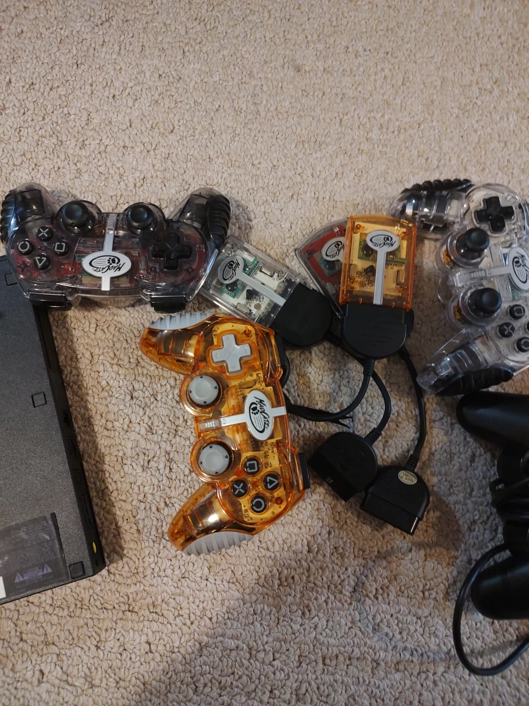 Includes a black PlayStation 2 console, model SCPH-70011. Comes with two black wired DualShock 2 controllers and two clear aftermarket controllers (one black, one orange). Several memory cards and AV cables are also included. It's ready for gaming!