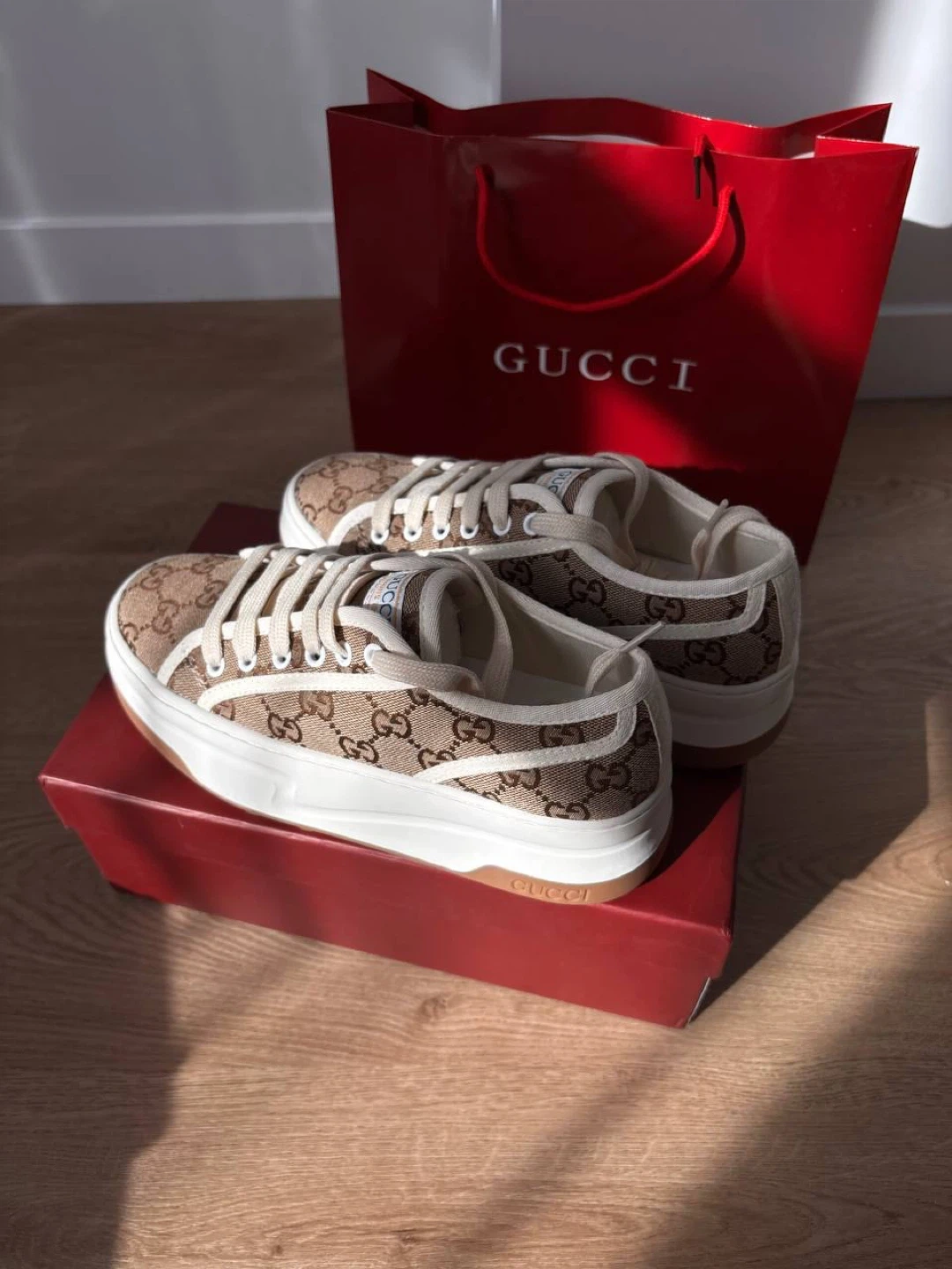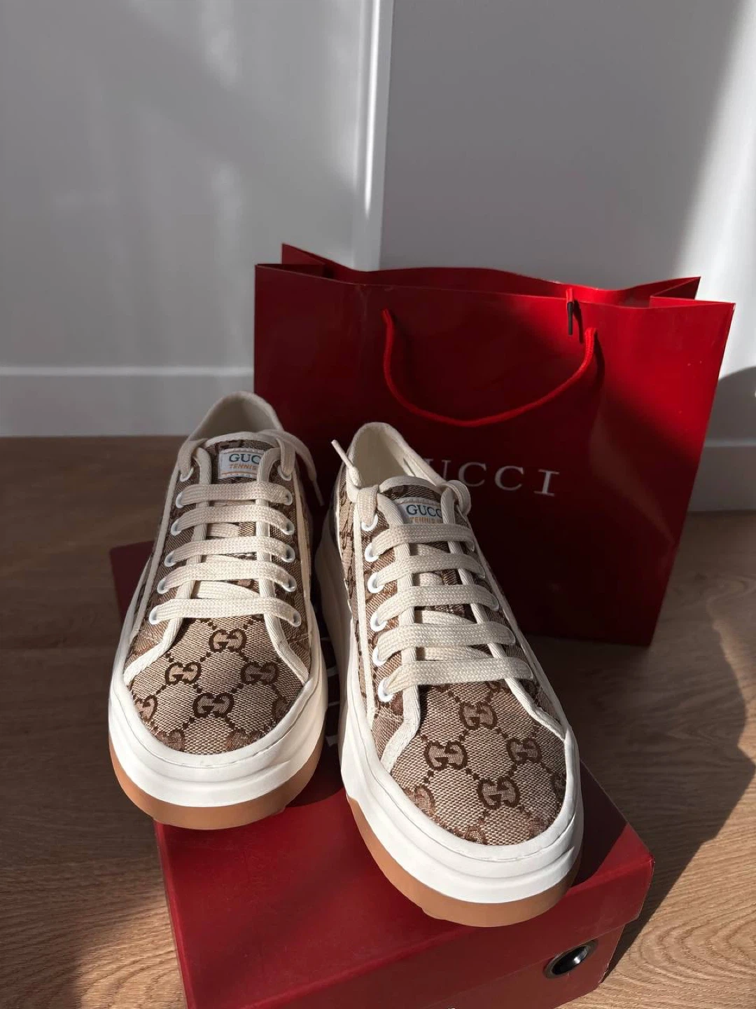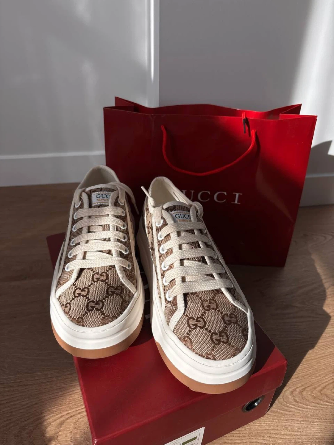 These Gucci GG canvas sneakers come in a classic brown and beige monogram pattern. They feature white laces and a thick white rubber sole with a brown trim. Includes original box .Perfect for everyday wear!