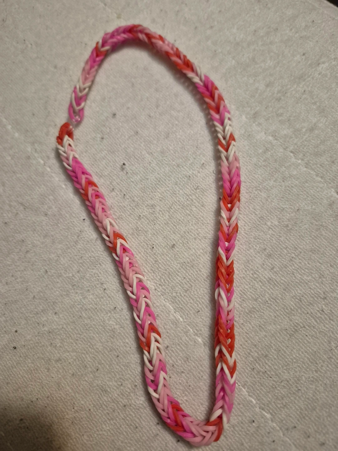 Handmade loom band bracelet. It's made with pink, white, and red rubber bands in a braided pattern. This bracelet is approximately 6 inches long.