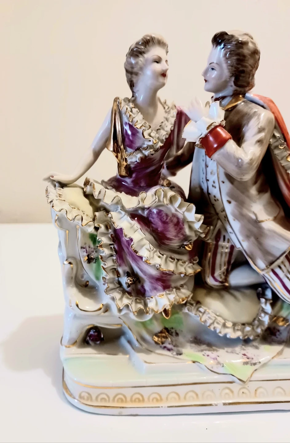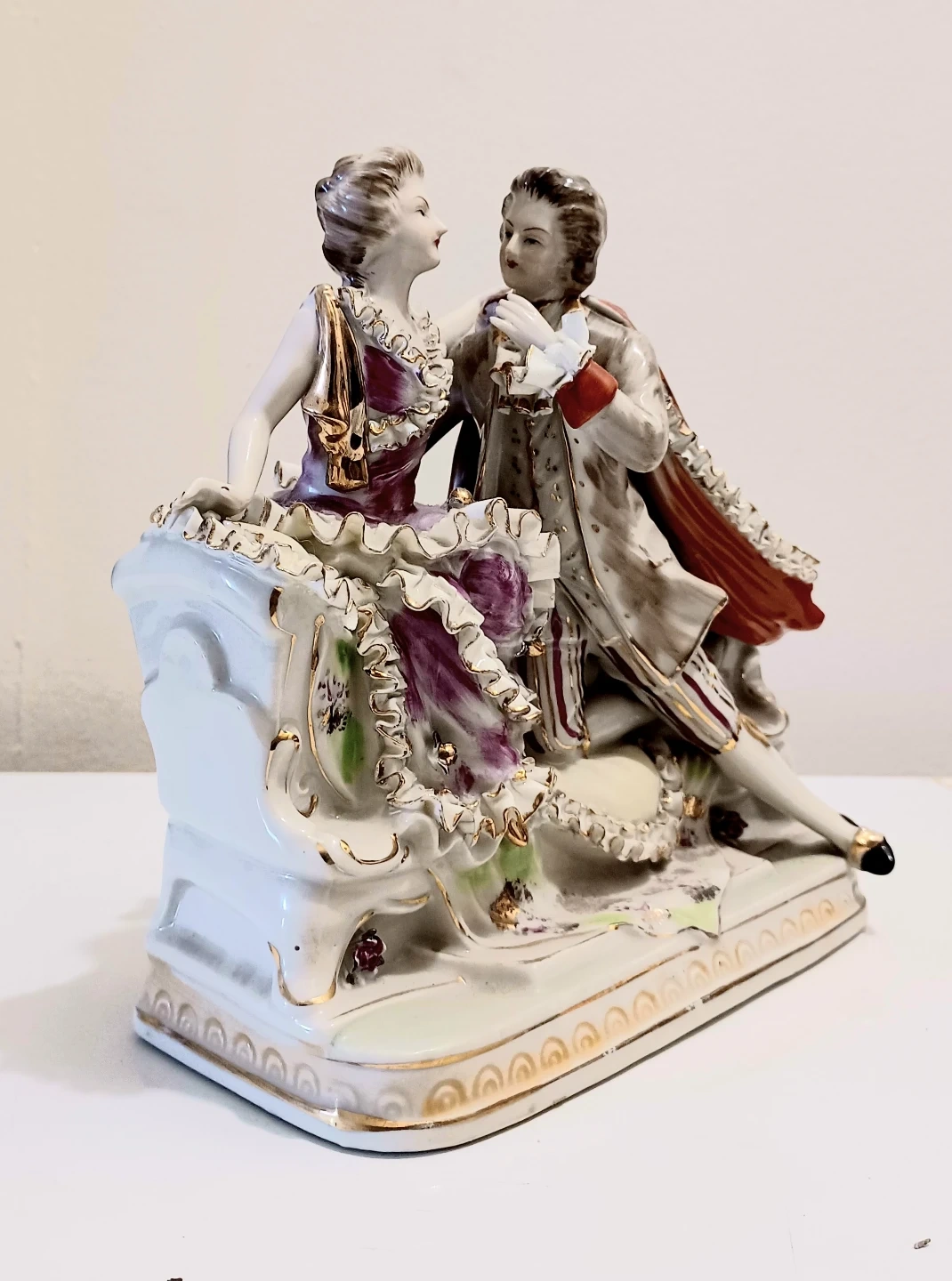 Elegant Bona China Lore Handpainted figurine features a beautifully detailed couple in period attire, showcasing intricate craftsmanship and delicate artistry, perfect for collectors. This piece is in good condition, showing some signs of its age but retaining its original charm and appeal.