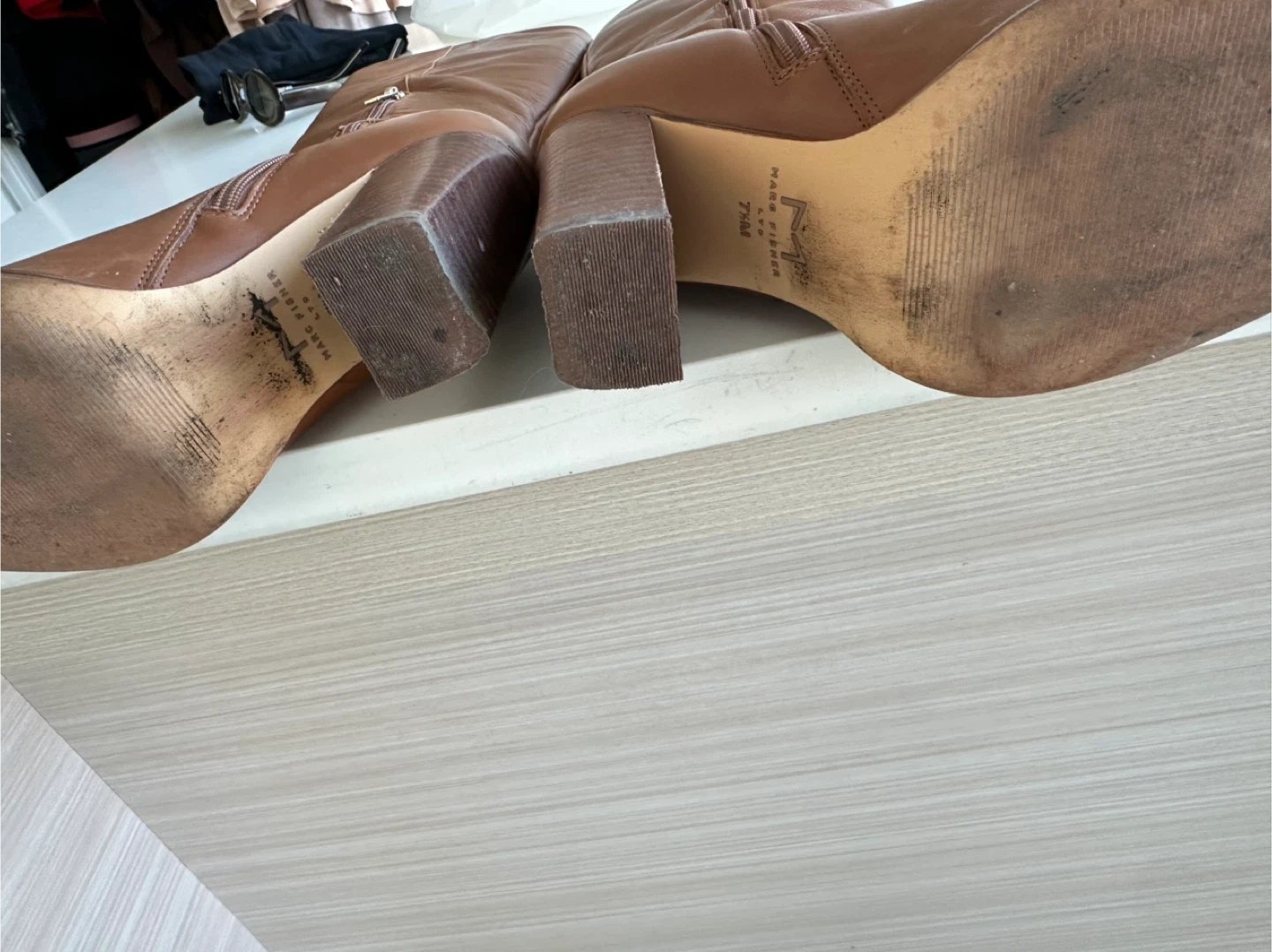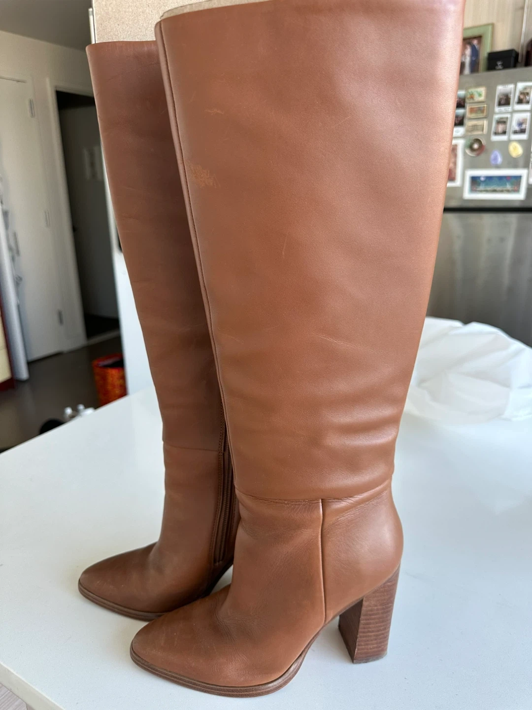 Classic brown leather knee-high boots from Marc Fisher LTD. These boots feature a stacked block heel and a pointed toe. Size 7.5M. Leather material. Zip closure on the inner side.