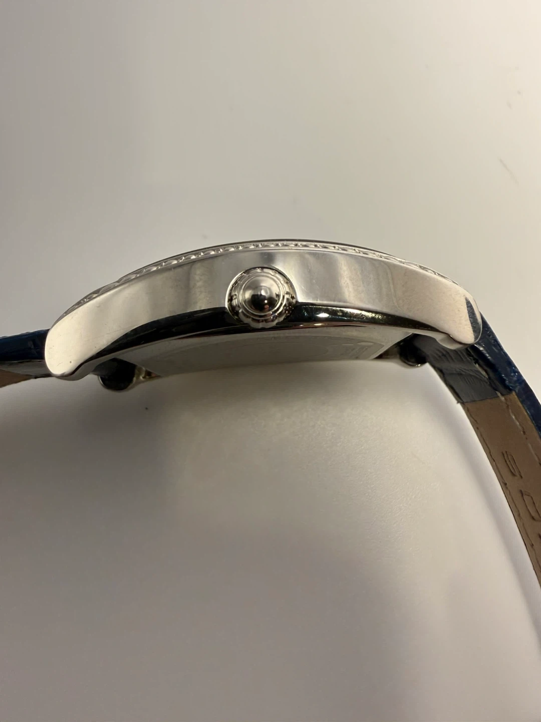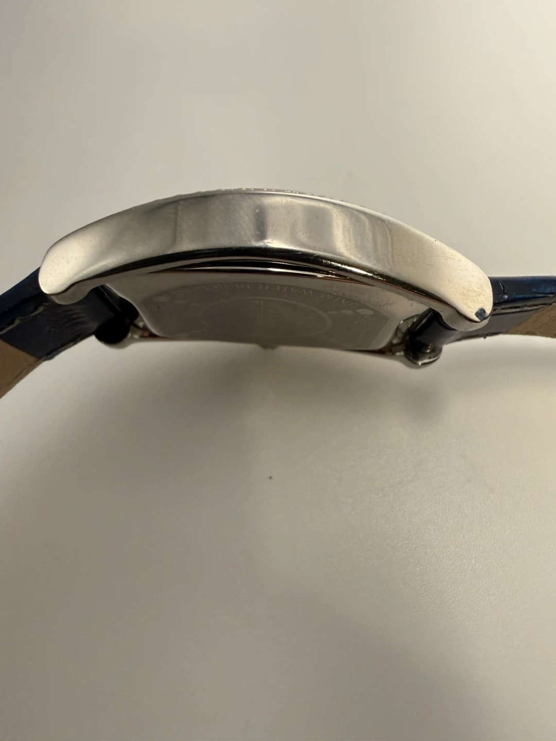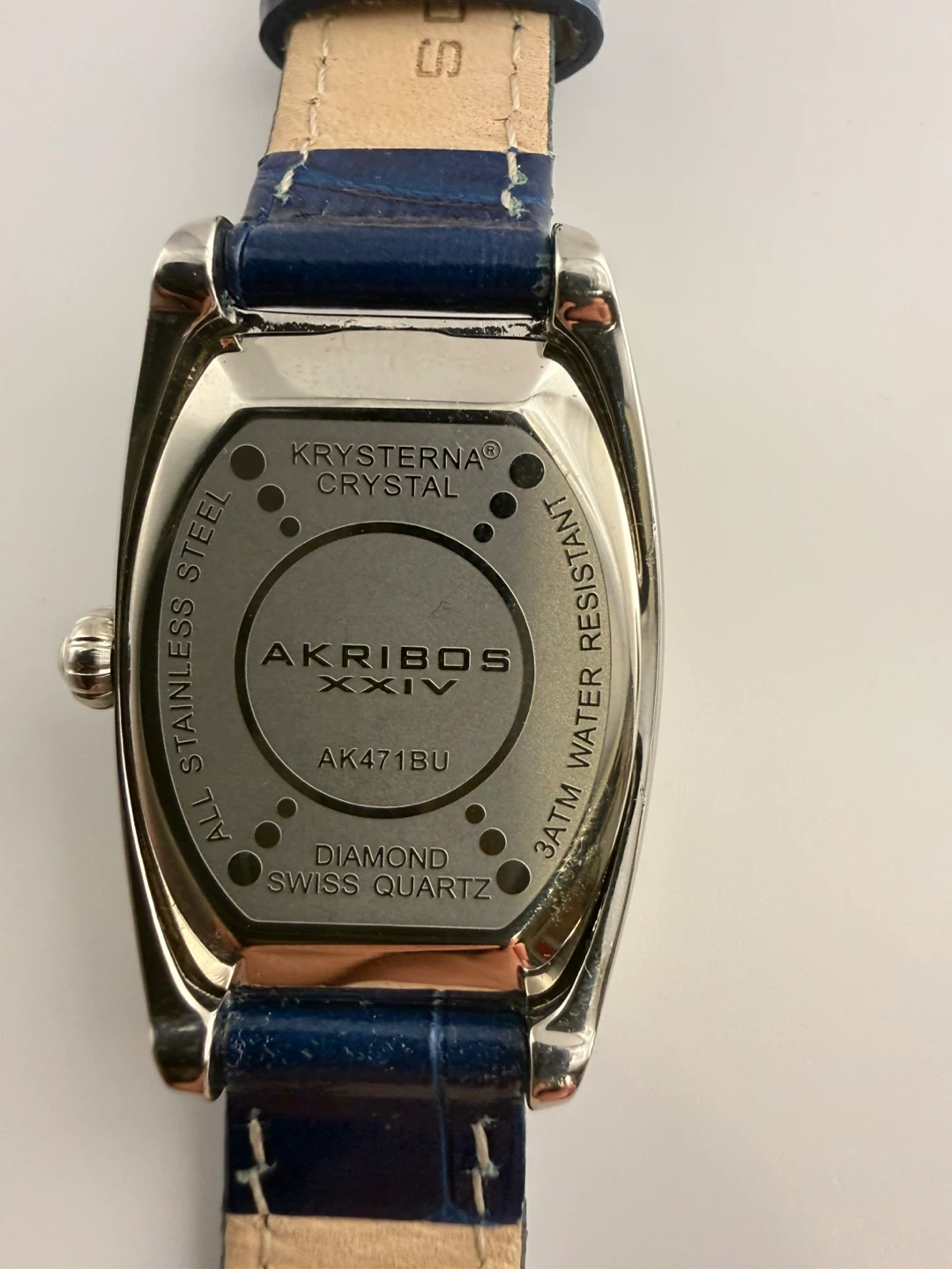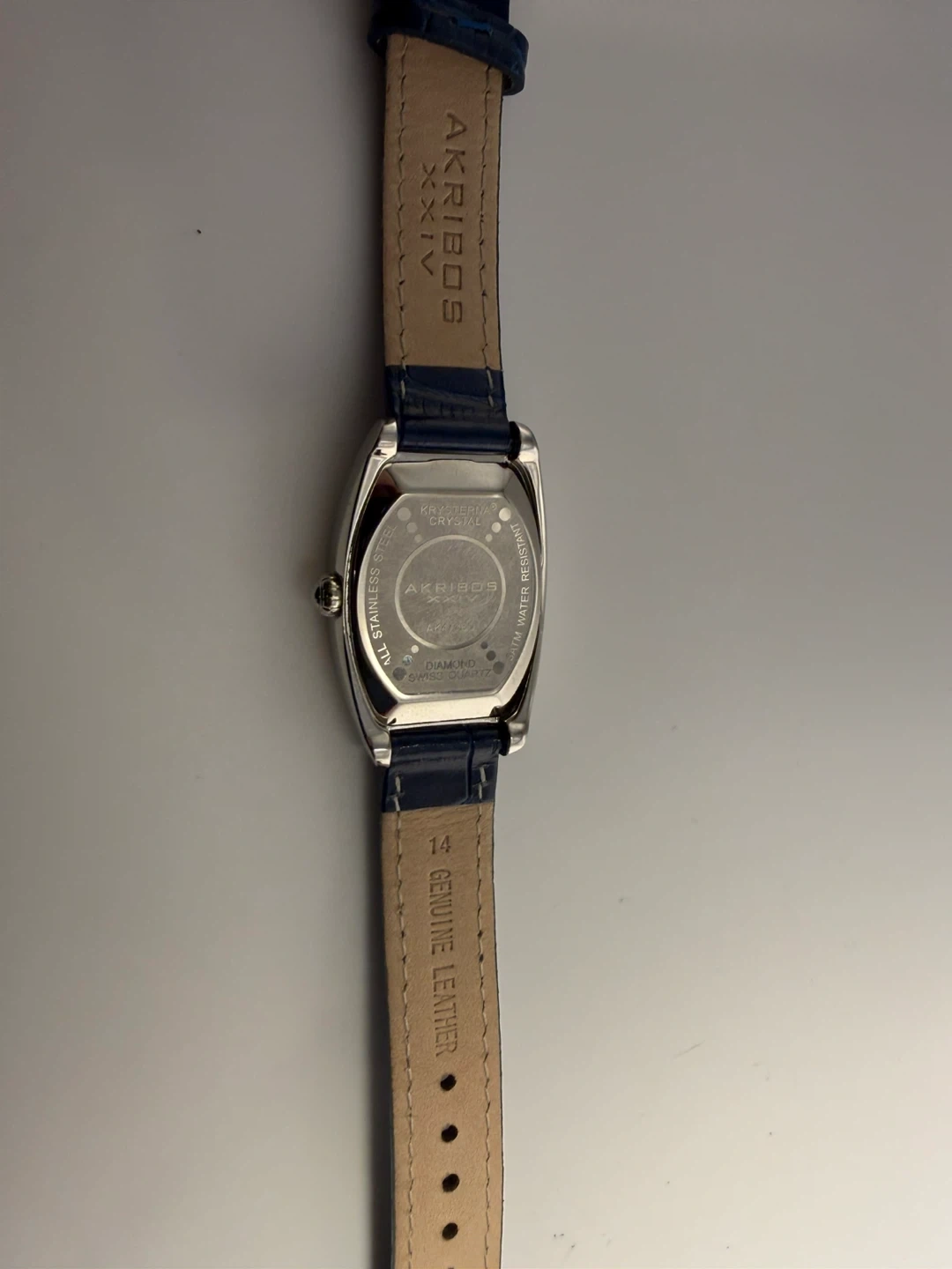 This Akribos XXIV watch features a blue dial with Roman numerals and a diamond accent. It has a genuine leather strap and is water-resistant up to 30 meters. It's powered by Swiss quartz movement.