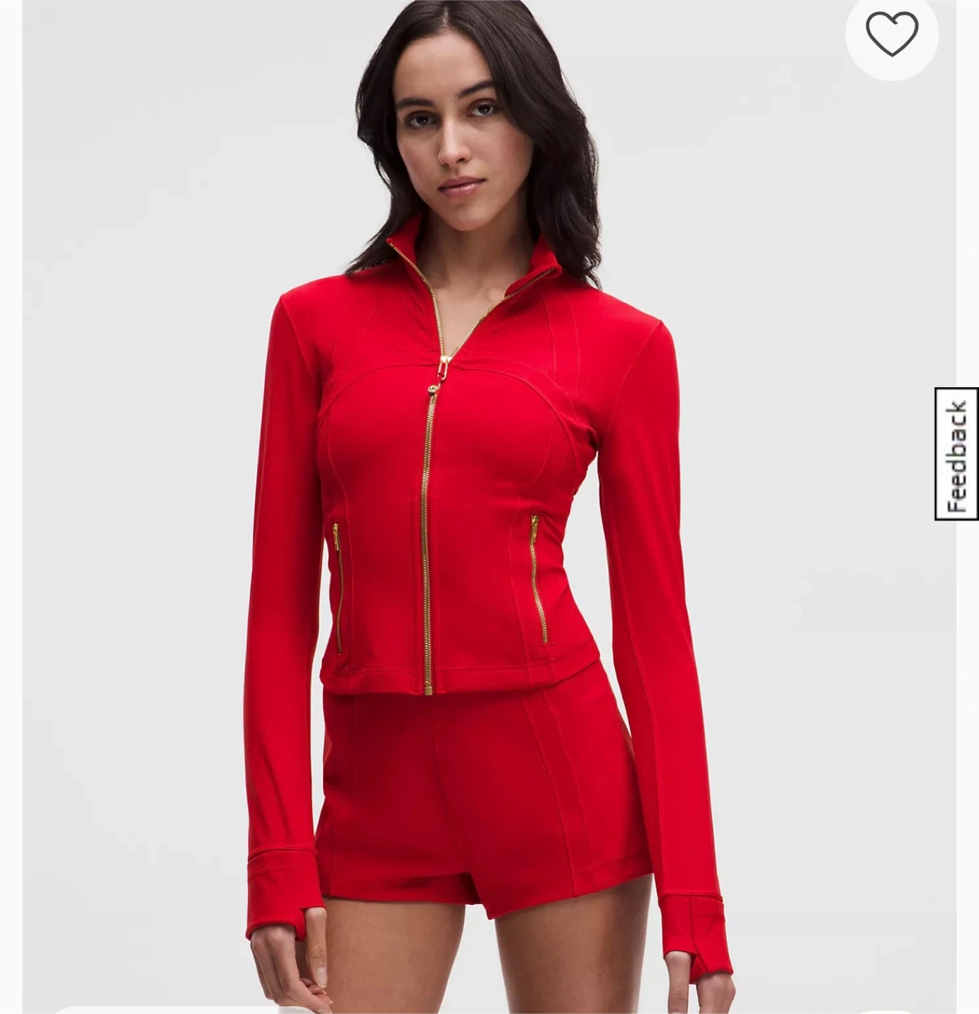 This Lululemon athletic jacket is bright red with gold zipper accents. It features a mock neck and long sleeves with thumbholes. Made from a stretchy performance fabric, it's designed for active wear.