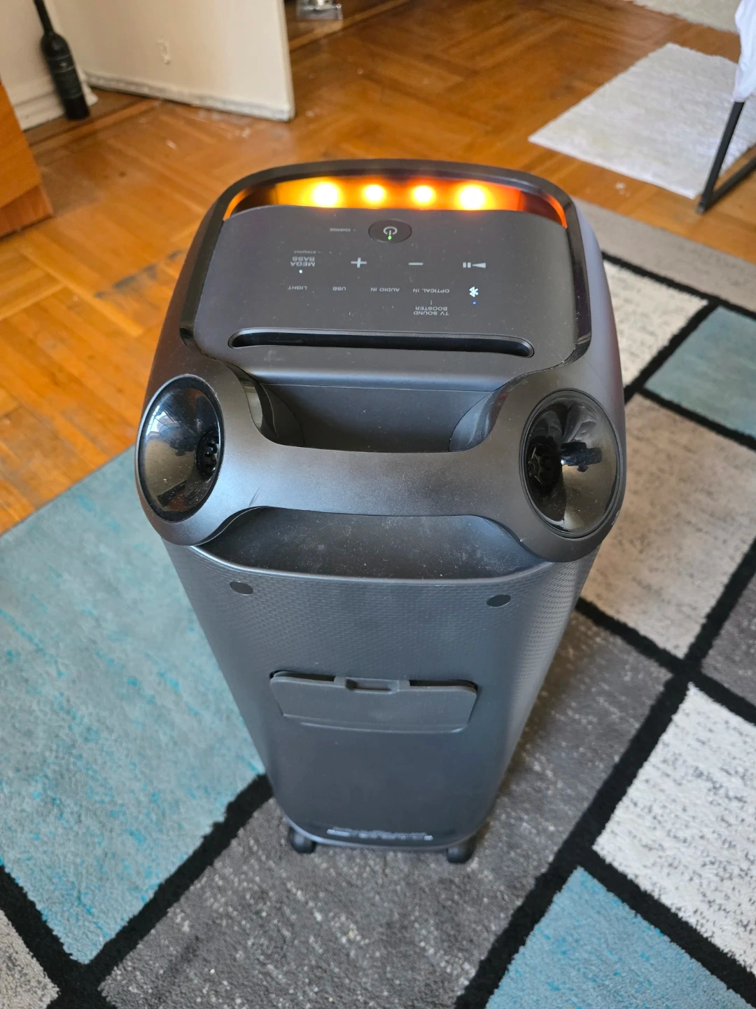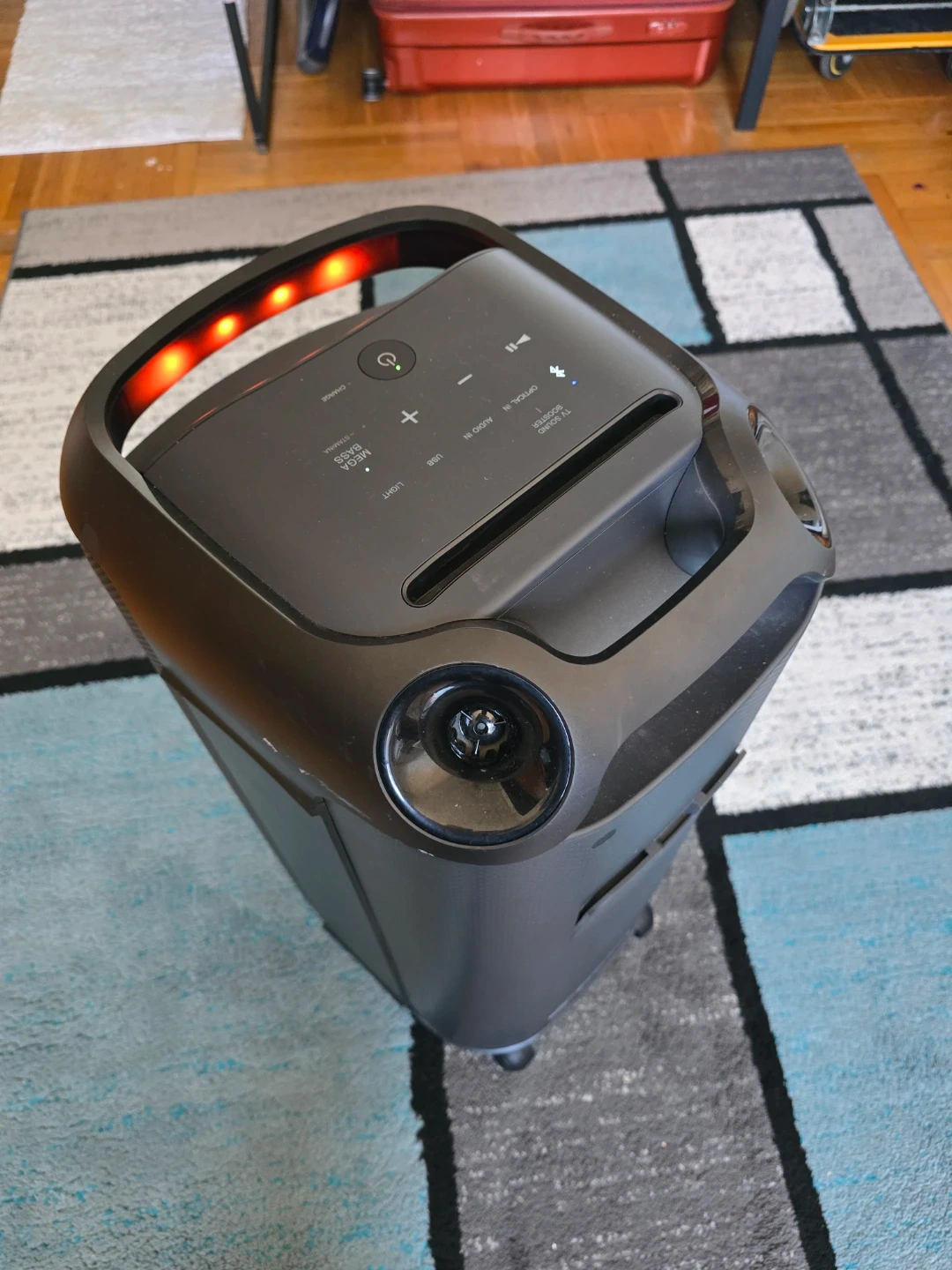 Selling a Sony SRS-XV800 party speaker. It features MEGA BASS for enhanced sound and has a TV SOUND BOOSTER function. It also has inputs for OPTICAL IN, AUDIO IN, and USB. There are some signs of wear.