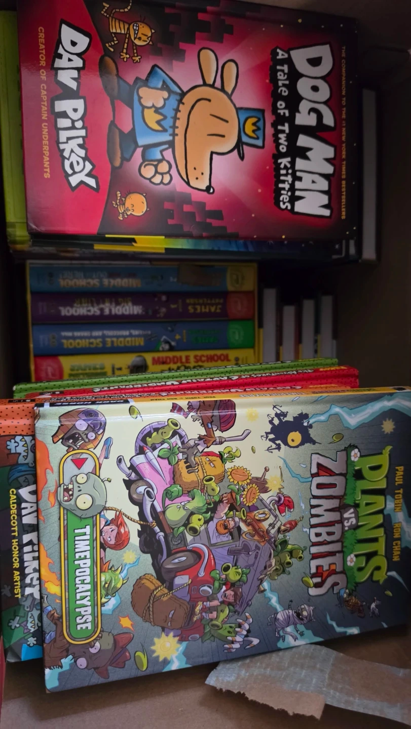 Collection of popular children's books including titles from the Dog Man series by Dav Pilkey and Diary of a Wimpy Kid by Jeff Kinney. Also includes Plants vs. Zombies books. Great for young readers!
