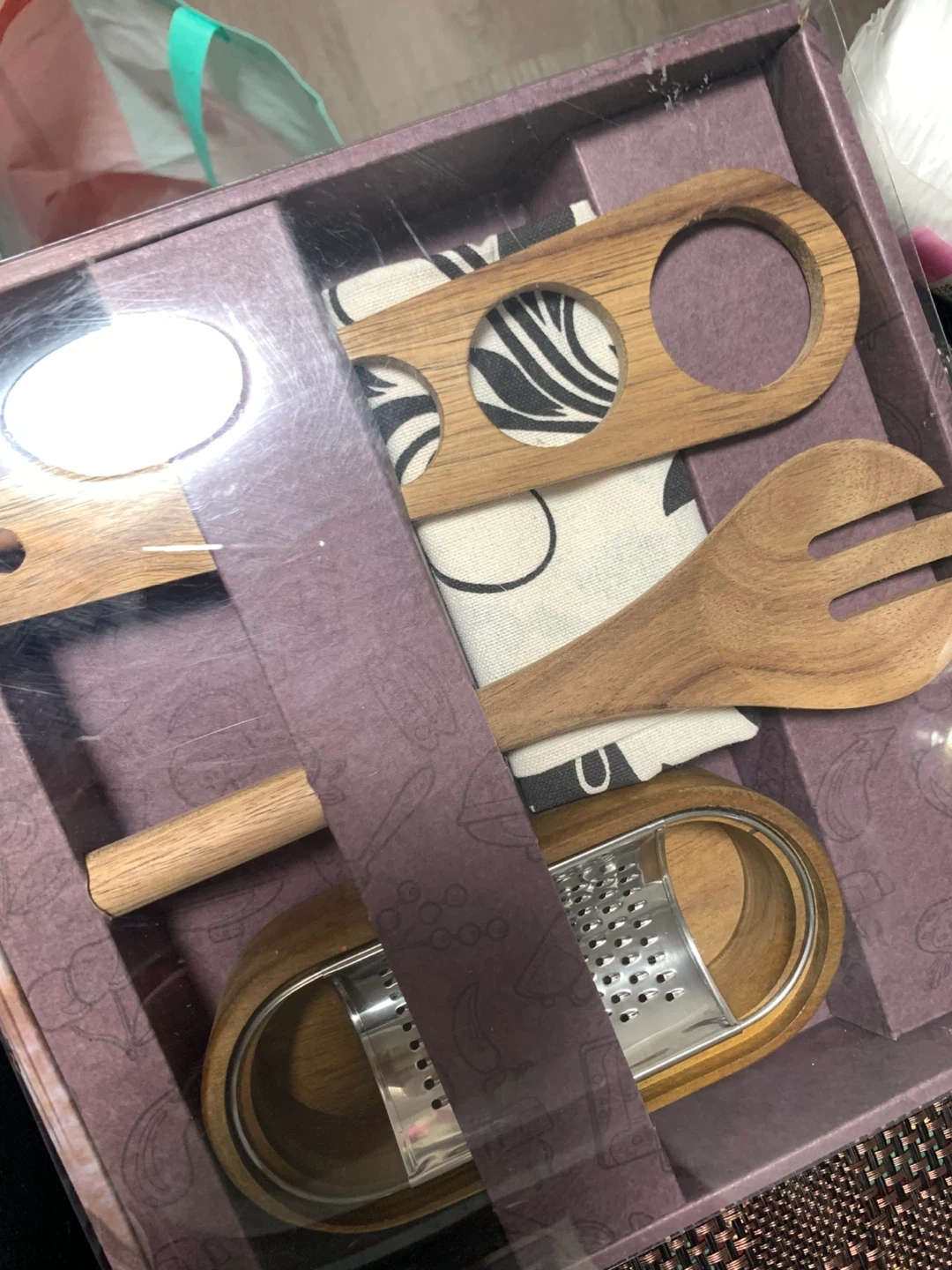 Selling a brand new wooden salad serving set, still in its original box! Includes a serving spoon, fork, and a unique grater, perfect for adding a touch of natural elegance to your table