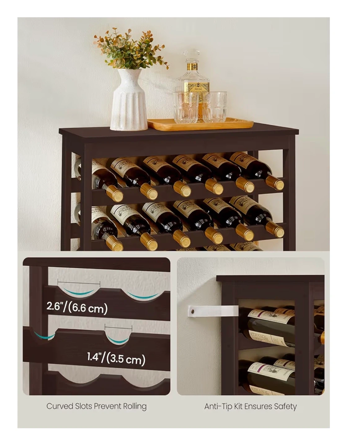 This SONGMICS wine rack holds up to 42 bottles. It's made of bamboo with an espresso finish. The product size is 26" L x 11.4" W x 39.2" H. It includes an anti-tip strap for safety.