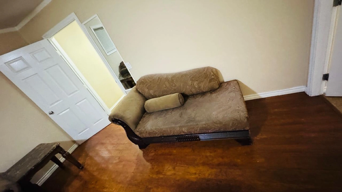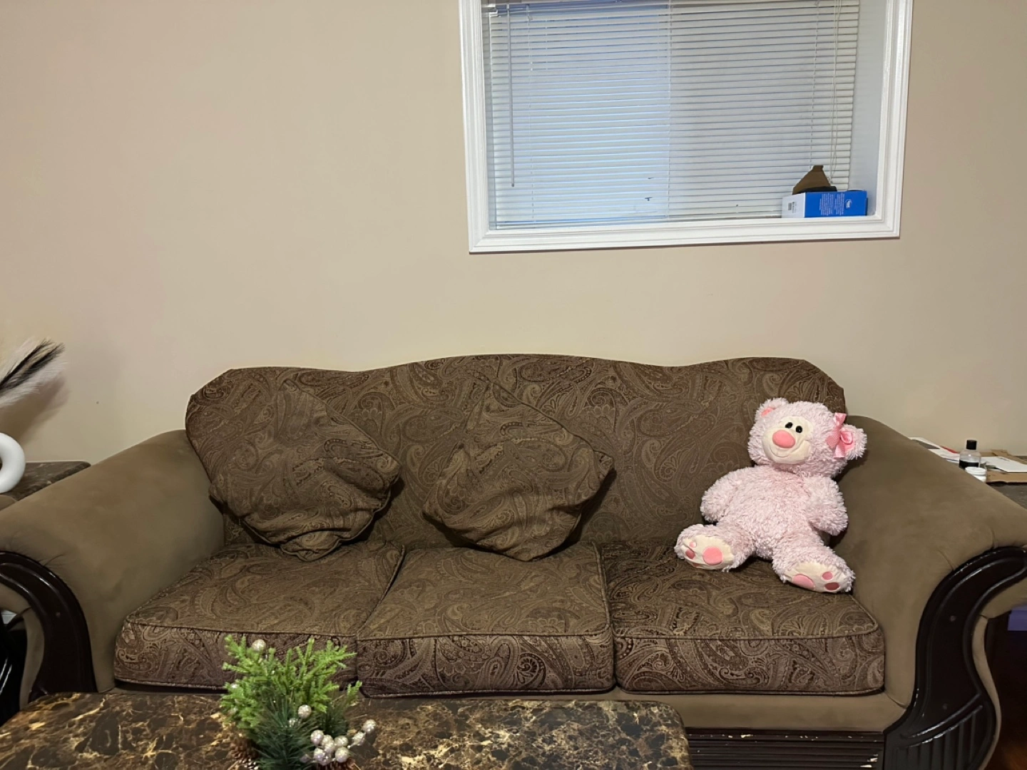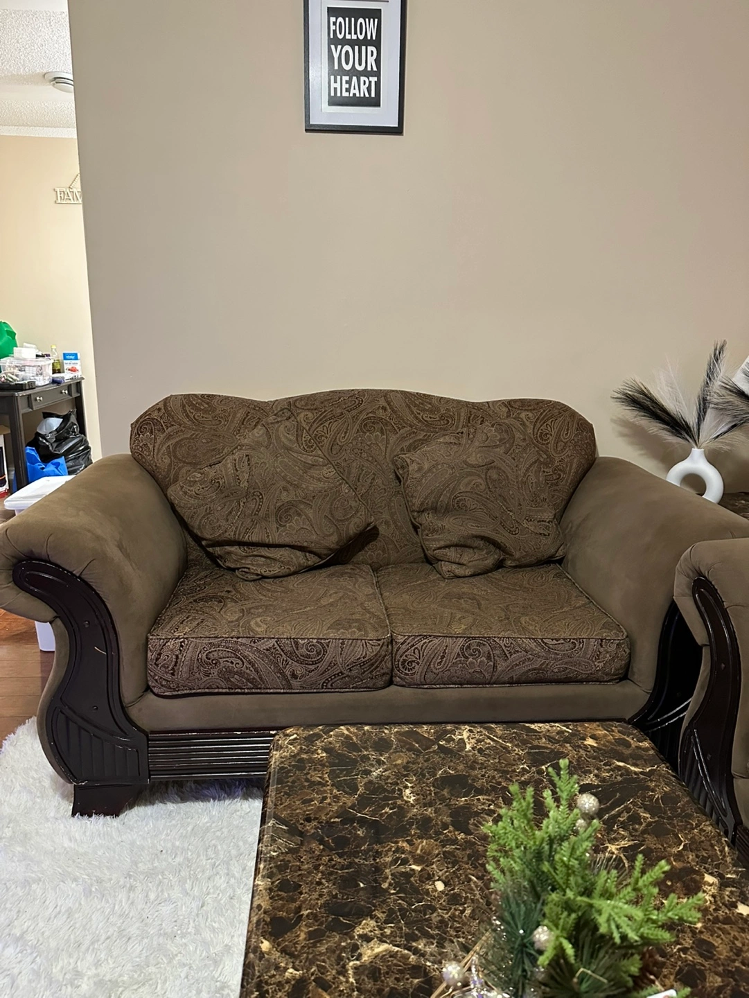 Three-piece living room set. Brown fabric upholstery with paisley pattern. Includes loveseat, sofa, and chaise lounge. Dark brown wooden legs. Good condition.
