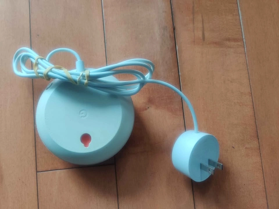 Google Nest Mini smart speaker in aqua blue. Comes with a power cord. Works great with Google Assistant for playing music and controlling smart home devices.