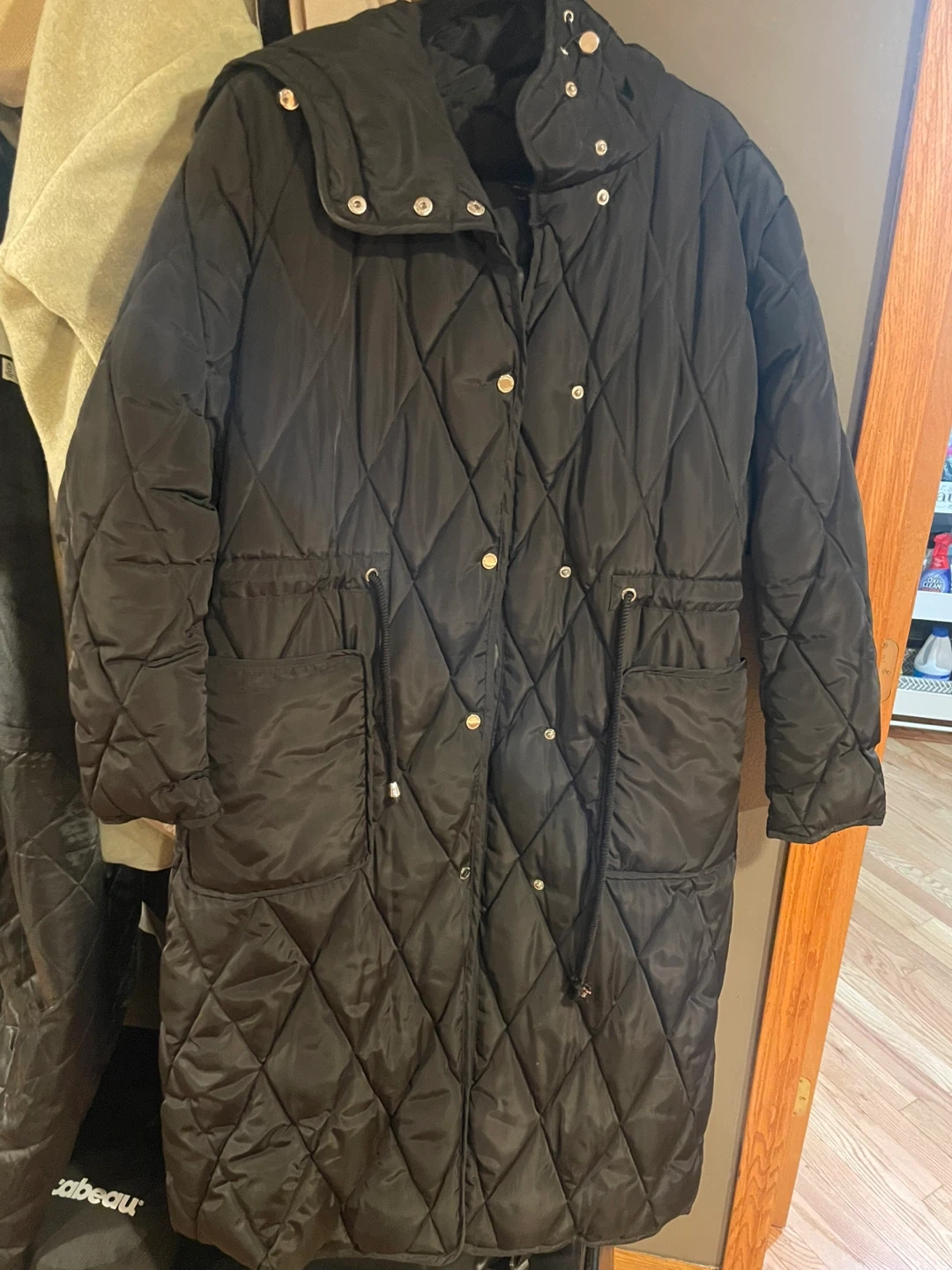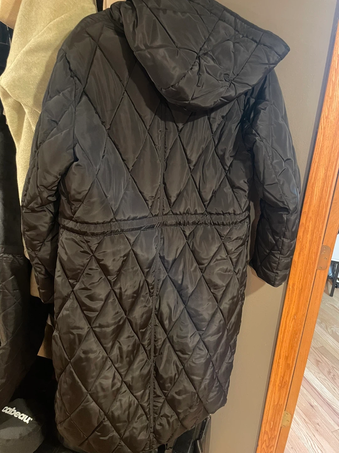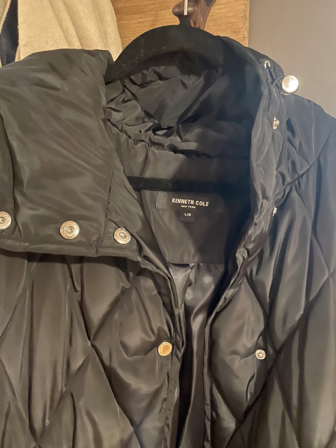 Kenneth Cole black quilted puffer coat with a high collar and hood. It features a snap closure, two front pockets, and a drawstring waist. Size L/G.