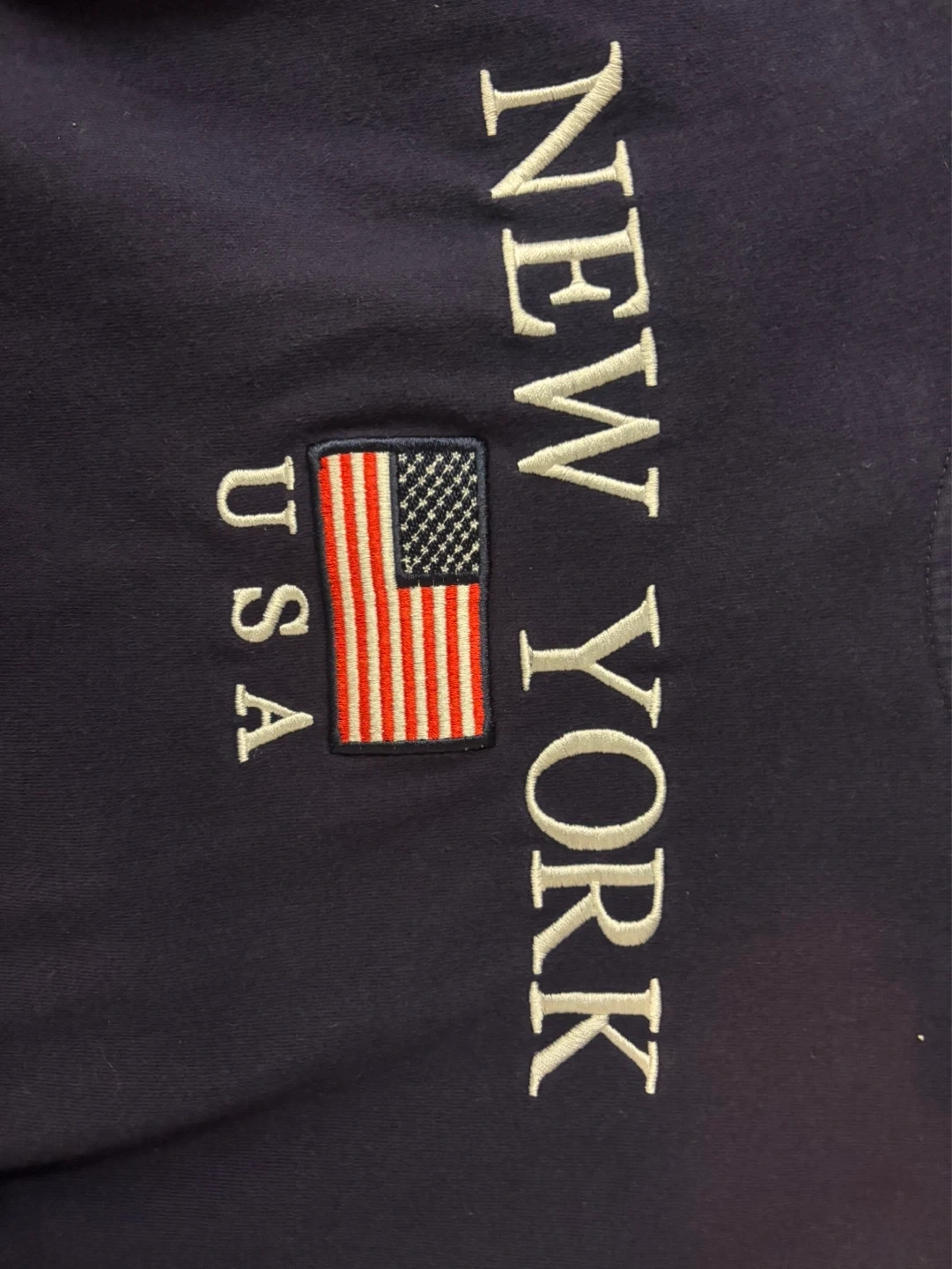 Navy blue sweatshirt with "New York USA" embroidered on the front, along with a small American flag graphic. It's a comfy pullover style. This sweatshirt would be nice for casual wear.