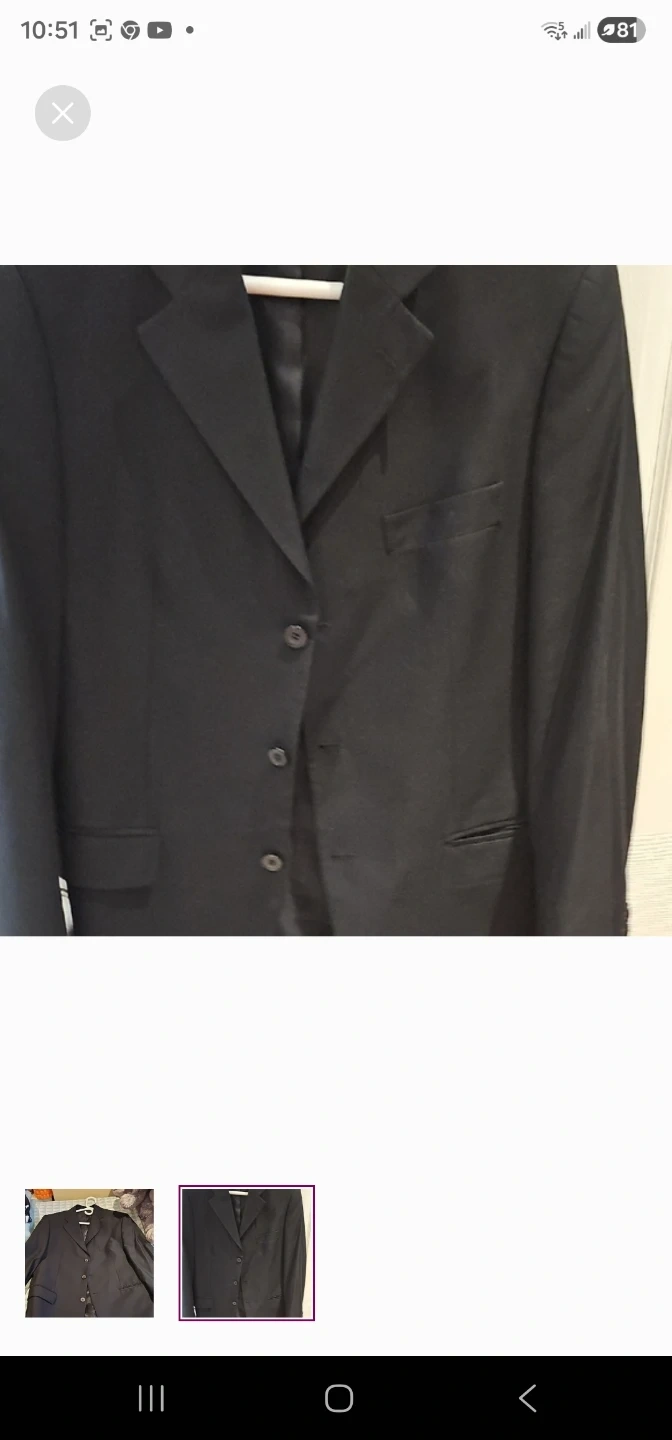 A classic black blazer for men. It's a versatile piece suitable for formal occasions or a smart casual look. This blazer has a notched lapel and three-button closure.