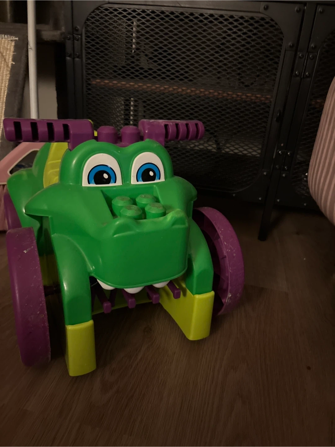 This fun green alligator ride-on toy is perfect for little ones. It features colourful purple wheels and yellow accents. Made of durable plastic, it's built for playtime adventures. A great way for toddlers to develop coordination!