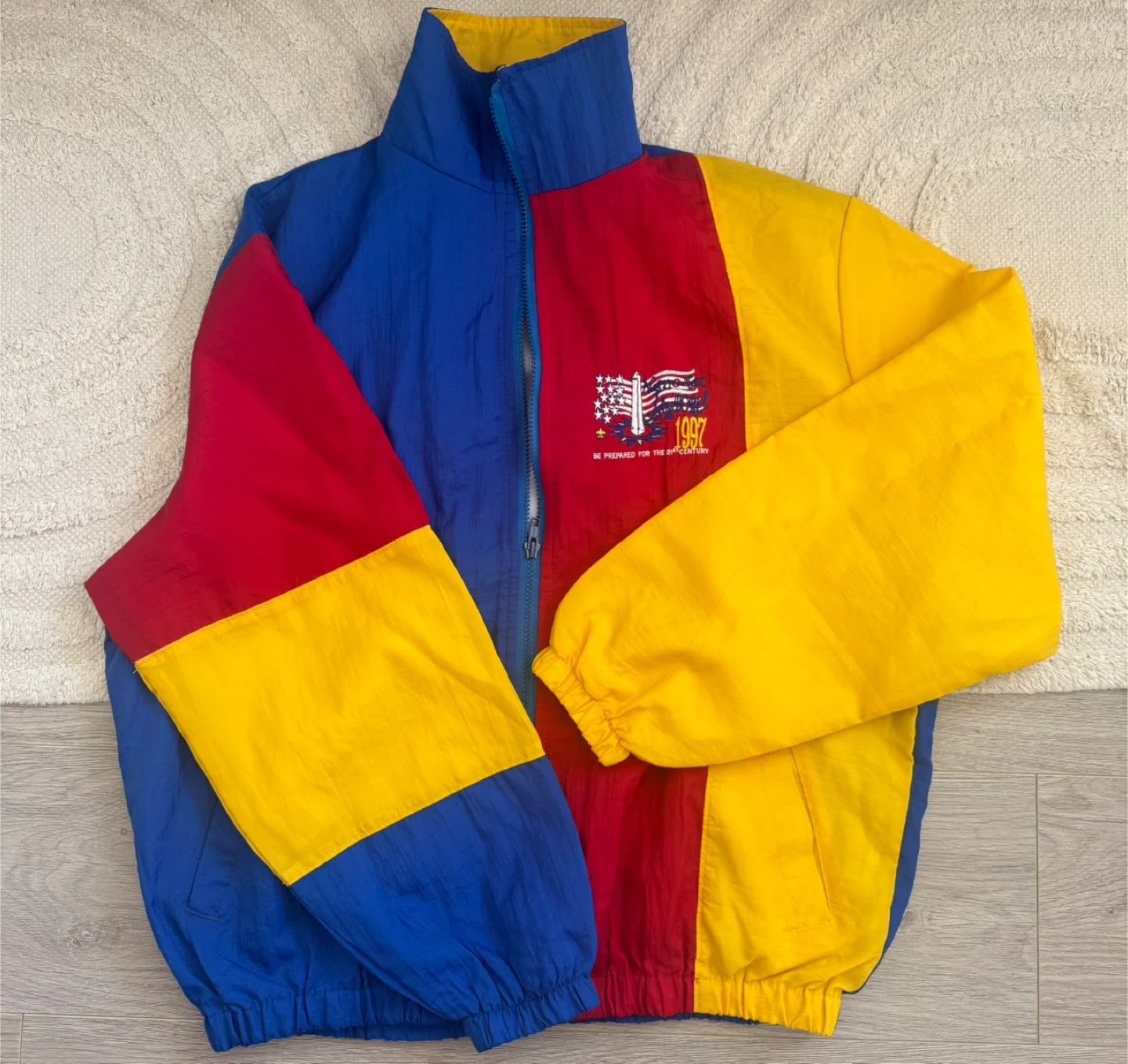 This color block jacket by WestArk. Made in the USA. Features a 1997 graphic on the chest.