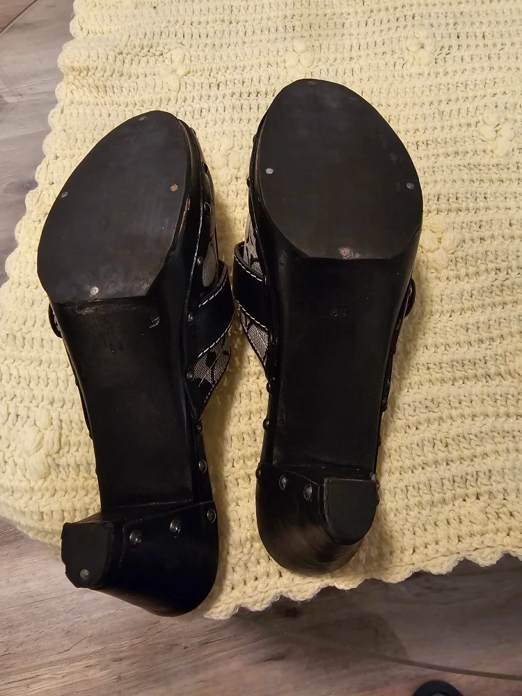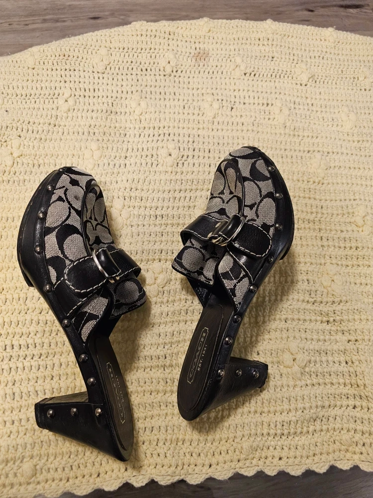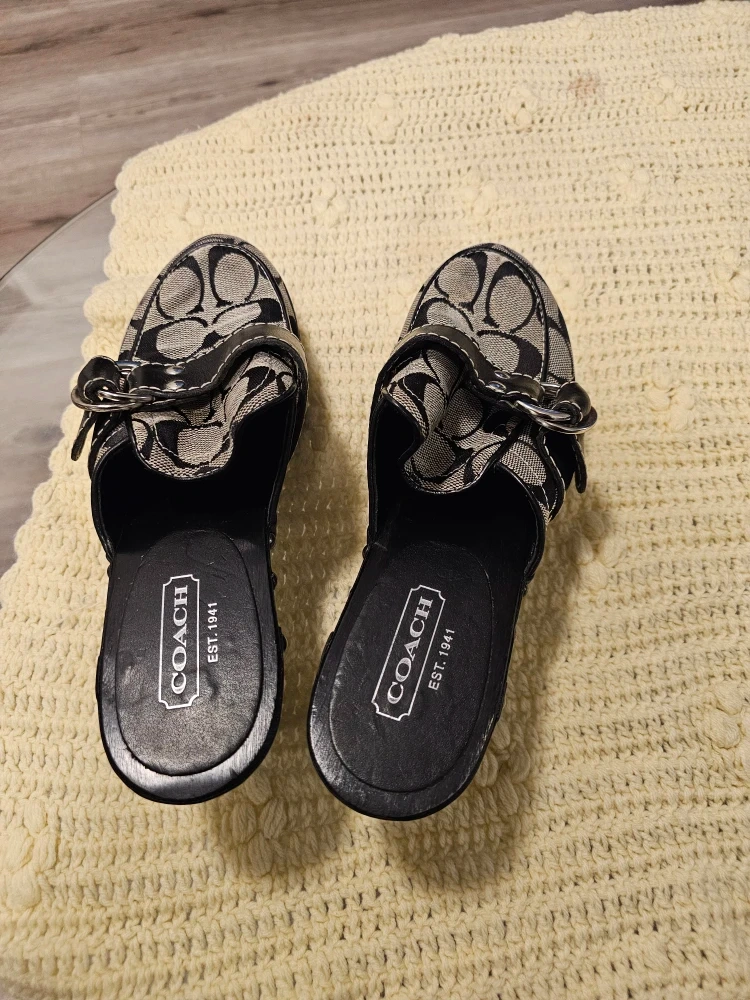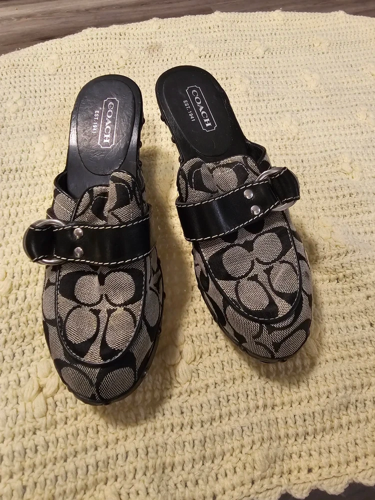 Selling a pair of Coach mules in size 8 n a Half. They have a black and grey signature print with a black leather buckle detail. These are super cute and in great condition!