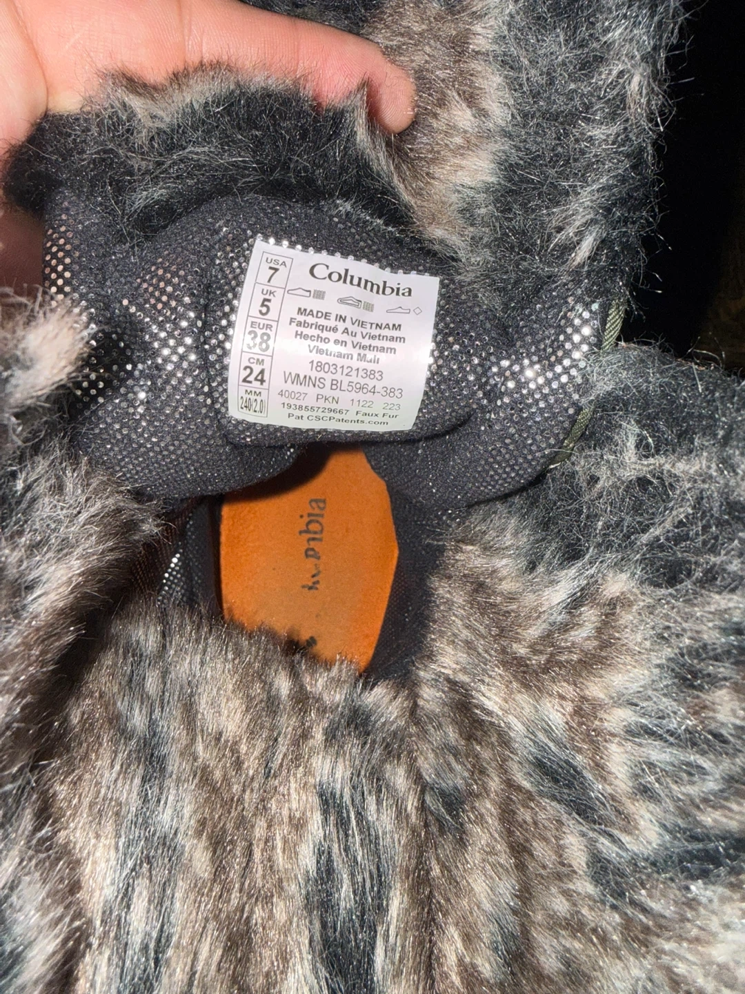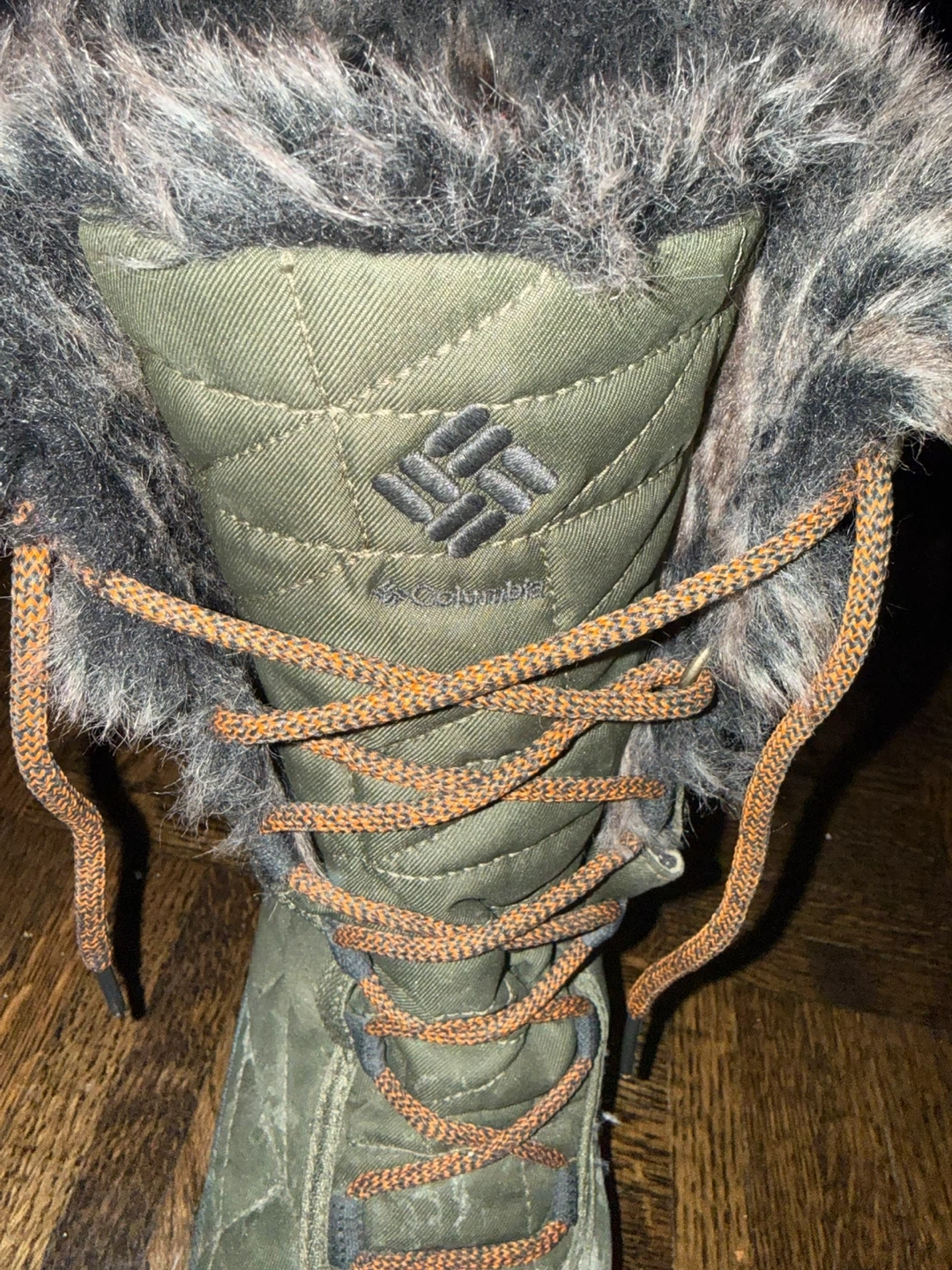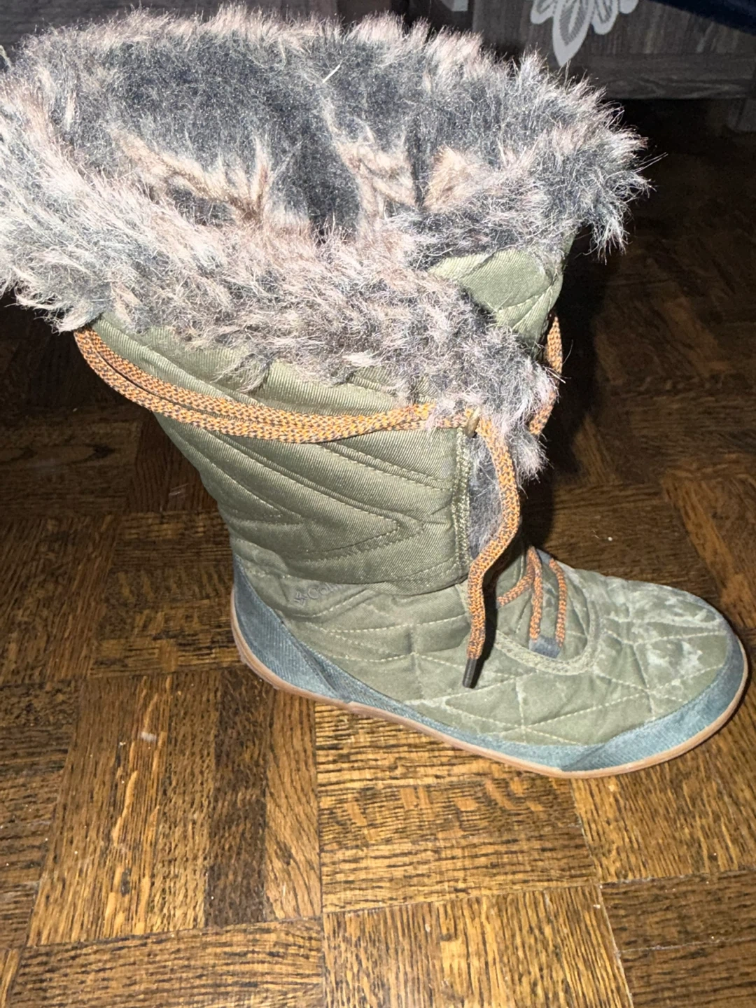 Columbia women's insulated winter boots in a size 7. These boots are designed for cold weather with a fuzzy trim. They feature lace-up closures for a secure fit. Made in Vietnam.