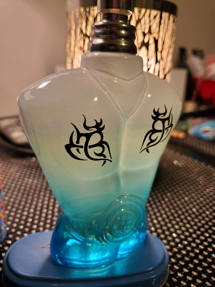 The bottle features a male torso shape with a blue-to-clear gradient and tribal-style "tattoo" designs on the chest. This design is widely considered a budget-friendly alternative or "dupe" for the iconic Jean Paul Gaultier "Le Male" series.