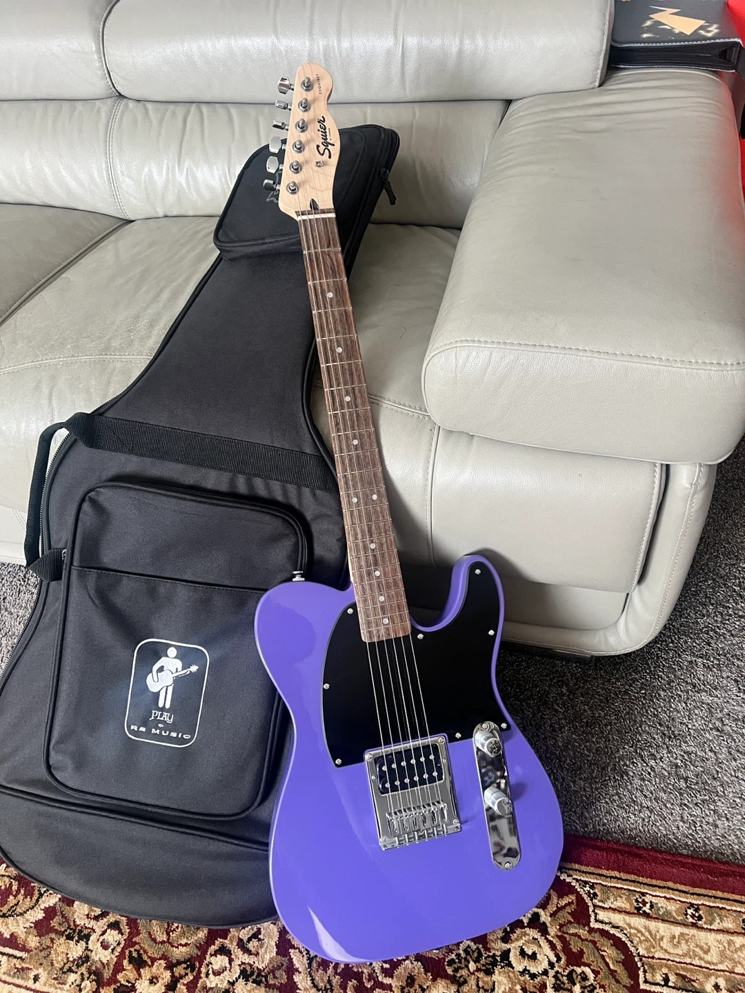 Squier electric guitar in a vibrant purple finish. It comes with a black gig bag for transport and protection. Ready for playing!