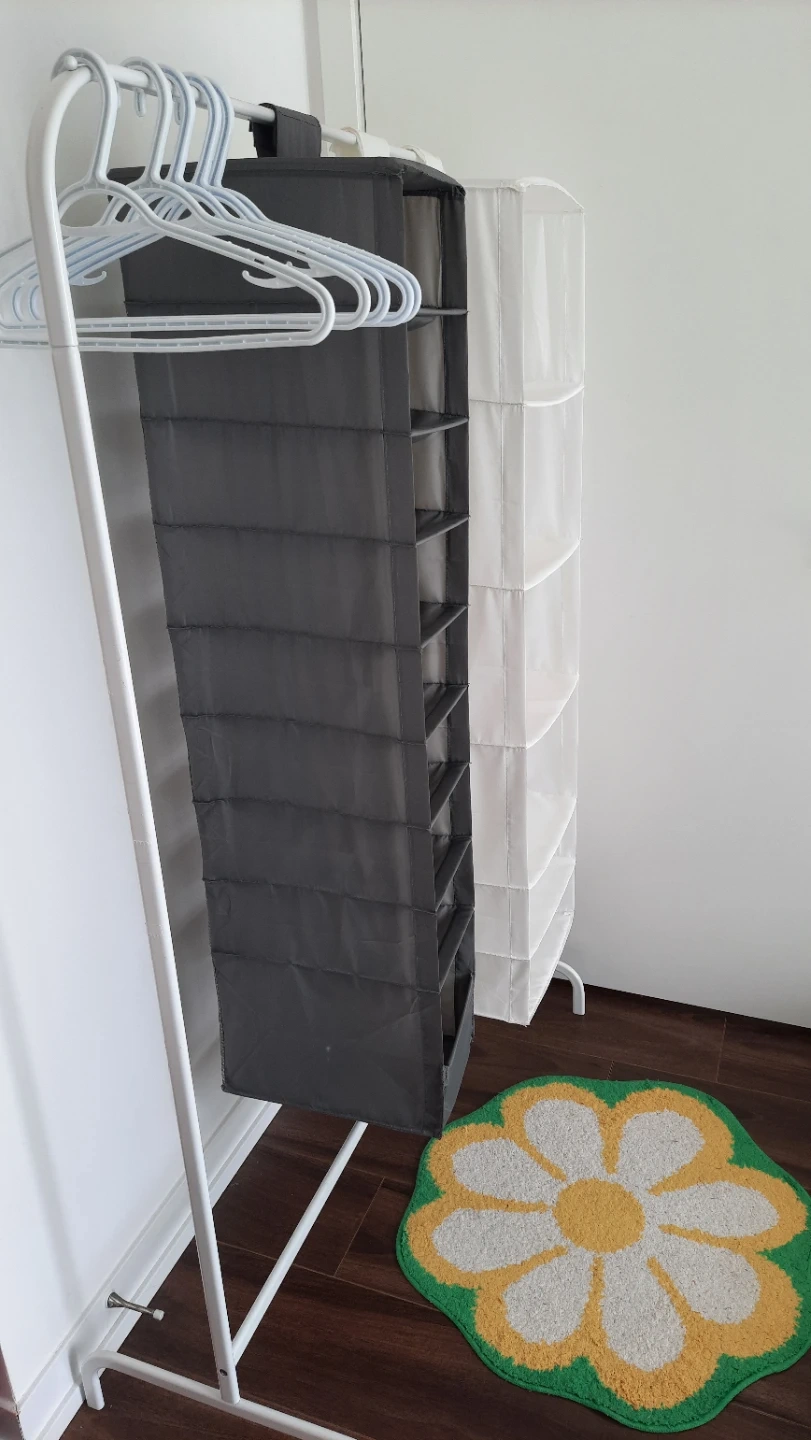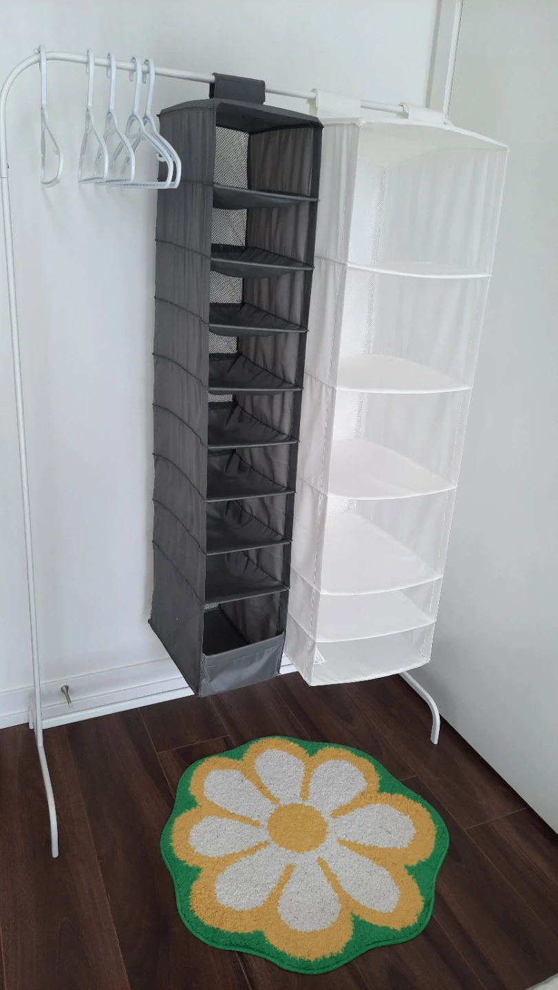 One is grey with 9 compartments (22cm×34cm×120cm) and the other is white with 6 shelves (35cm×45cm×125cm).
