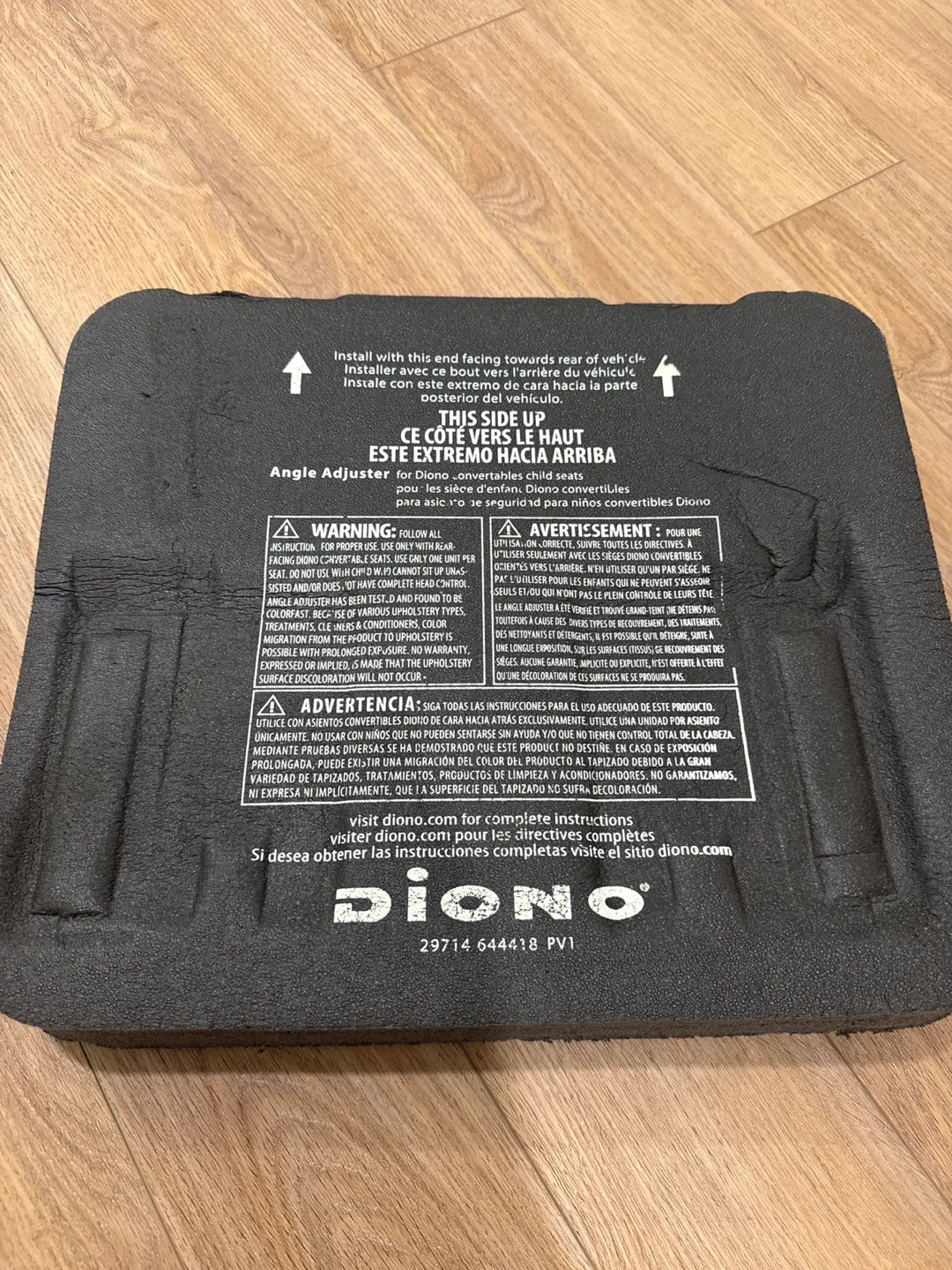 This is a Diono car seat angle adjuster. It's made of black foam material. It helps to achieve a better recline for infant car seats. Pick up only.