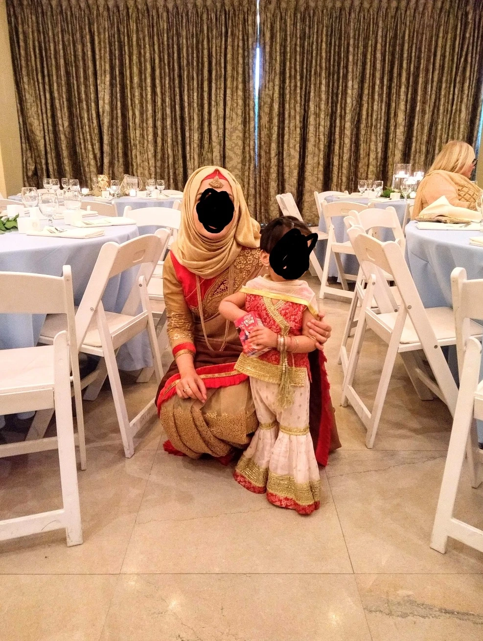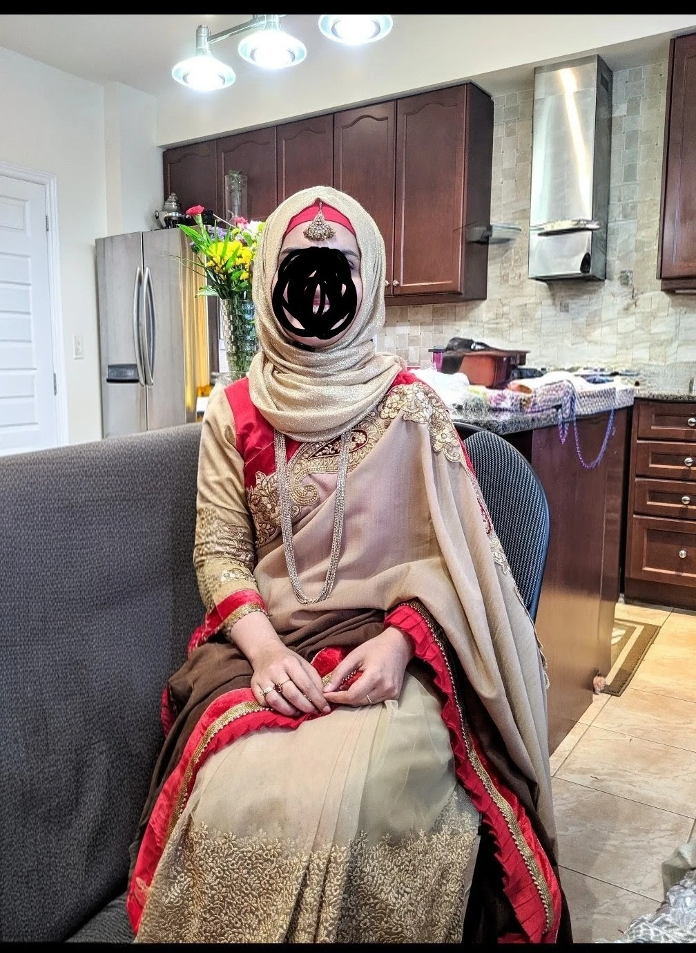 Gold and beige sari with red trim and intricate gold embroidery. This traditional garment is adorned with sparkling details. It's perfect for special occasions and cultural events. Sari includes a matching blouse piece.