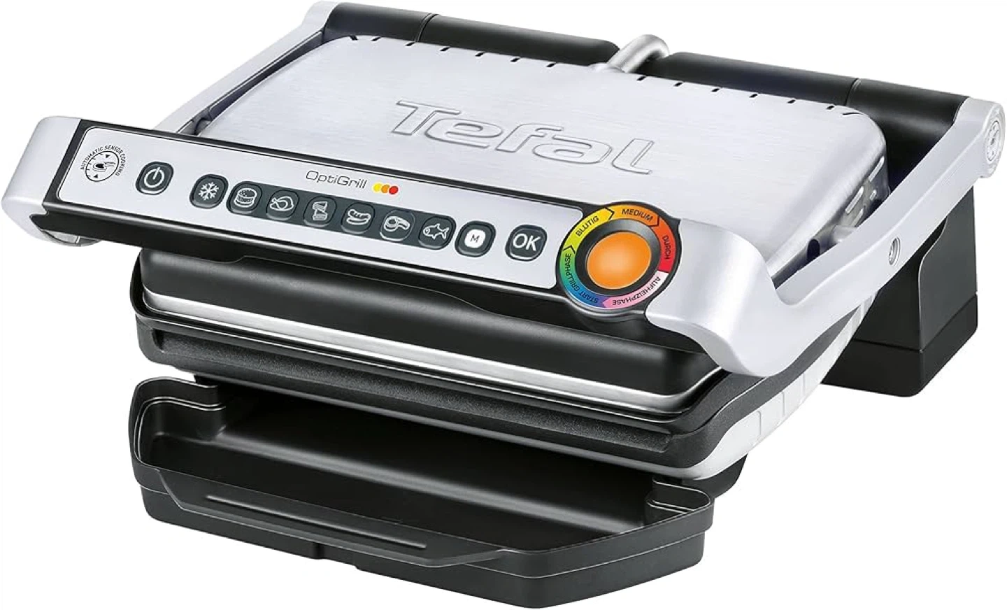 Smart indoor grilling made easy with the T-fal OptiGrill. Features automatic sensor cooking technology that adjusts grilling time based on thickness and number of items. Choose from preset programs for burgers, poultry, sandwiches, sausages, red meat, and fish, plus manual mode for custom cooking.