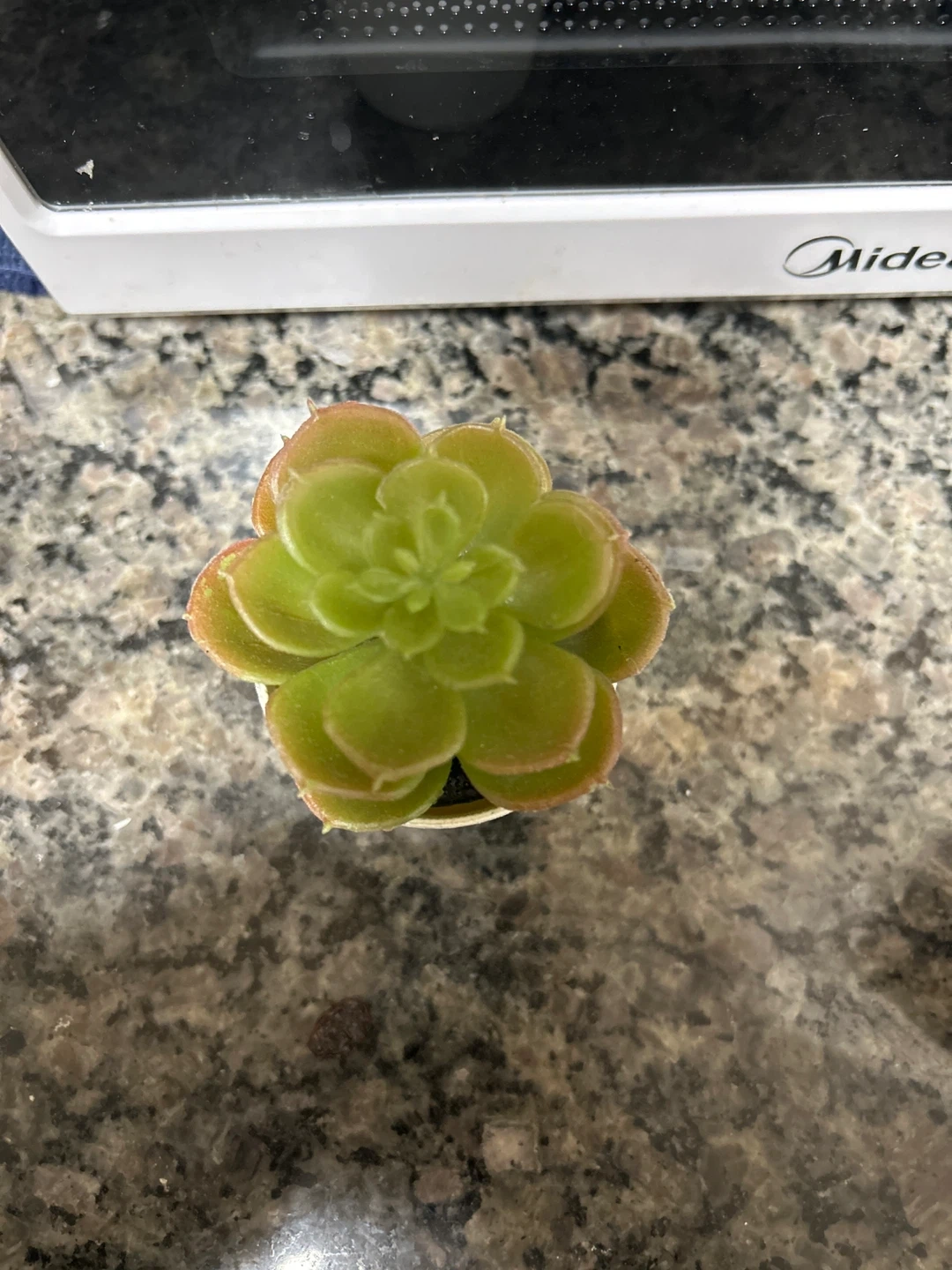 This is a small faux succulent plant. It comes in a textured white pot. Adds a touch of green to any small space.