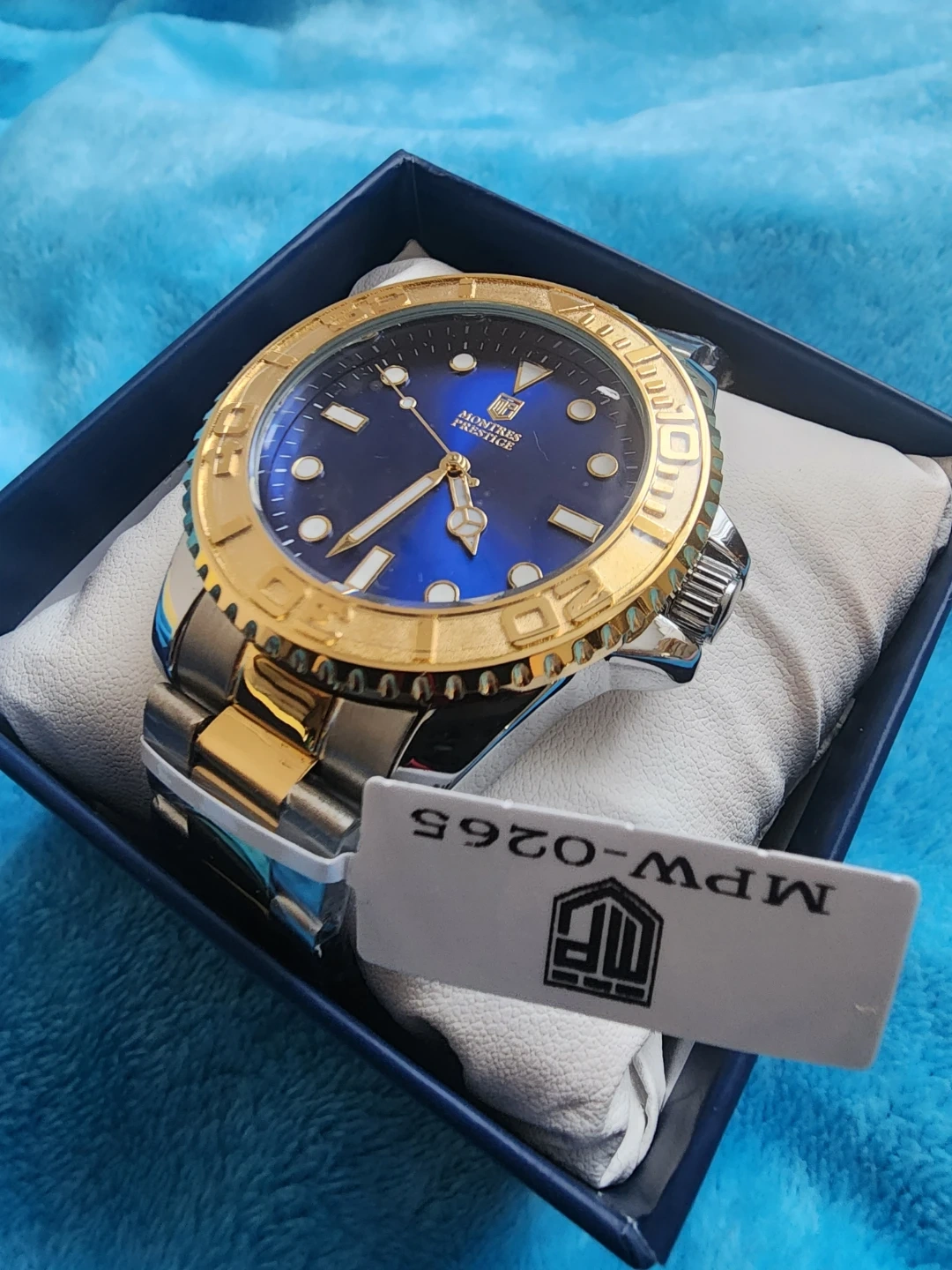 This is a New In Box Montres Prestige watch with a blue dial and gold-tone accents. It comes in its original box. The watch band is a mix of silver and gold-tone stainless steel.