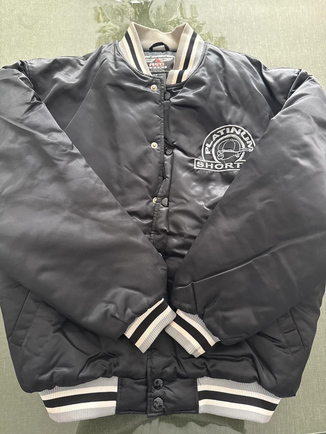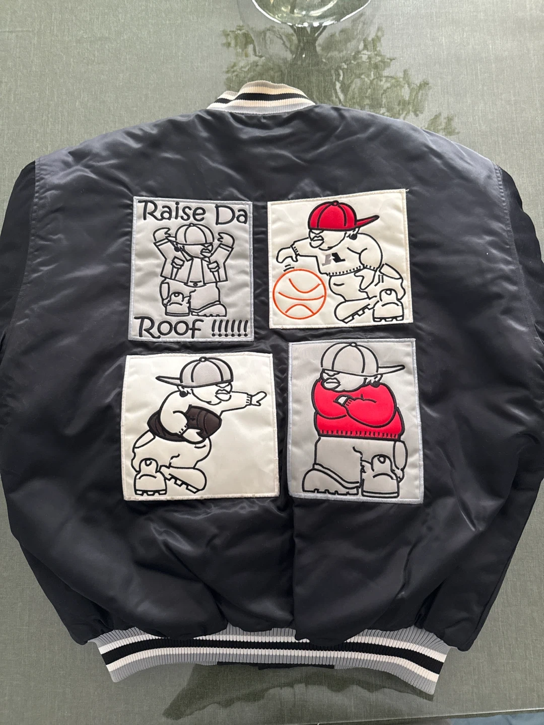 This is a Platinum Short bomber jacket. It's black with striped cuffs and collar. The back features four embroidered patches with cartoon characters and text.
