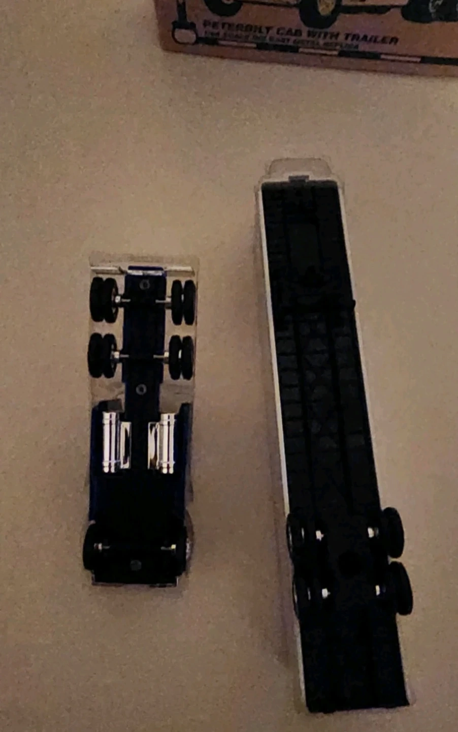 This is an Ertl Collectibles Peterbilt die-cast metal replica with a trailer. It's a 1:64 scale model. A percentage of its profits are donated to charities worldwide.