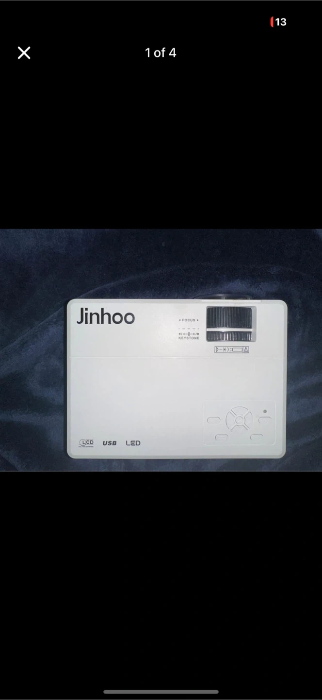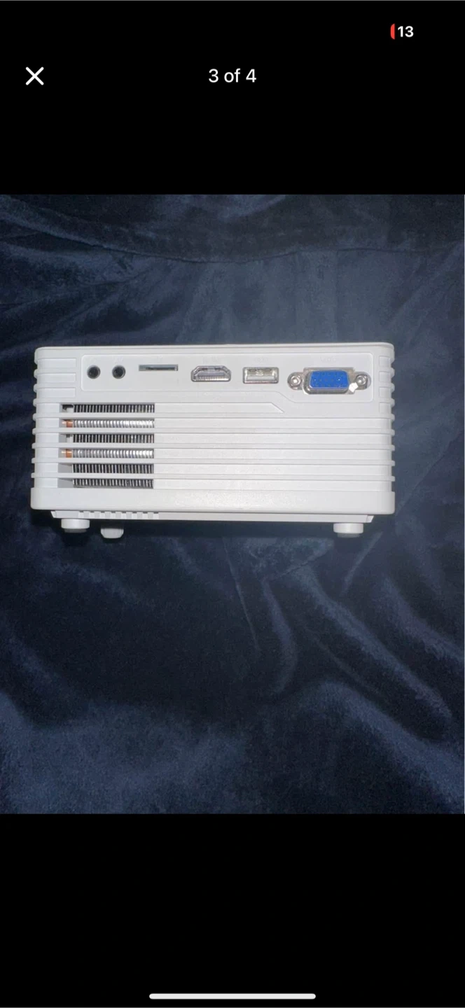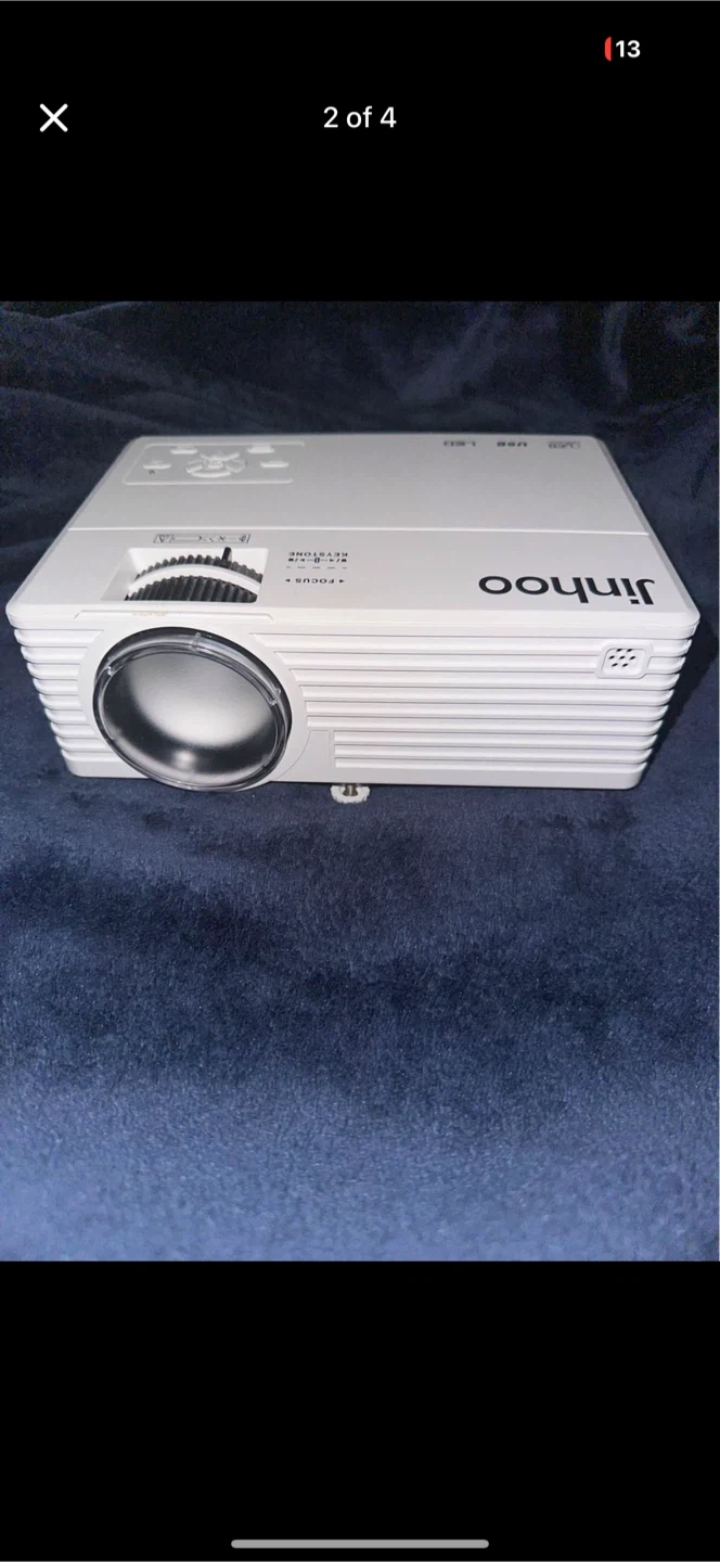 Compact white JinHoo mini projector. It's a LED projector with USB and SD card support. This unit comes with multiple input ports including HDMI. It's great for small presentations or home movie nights!