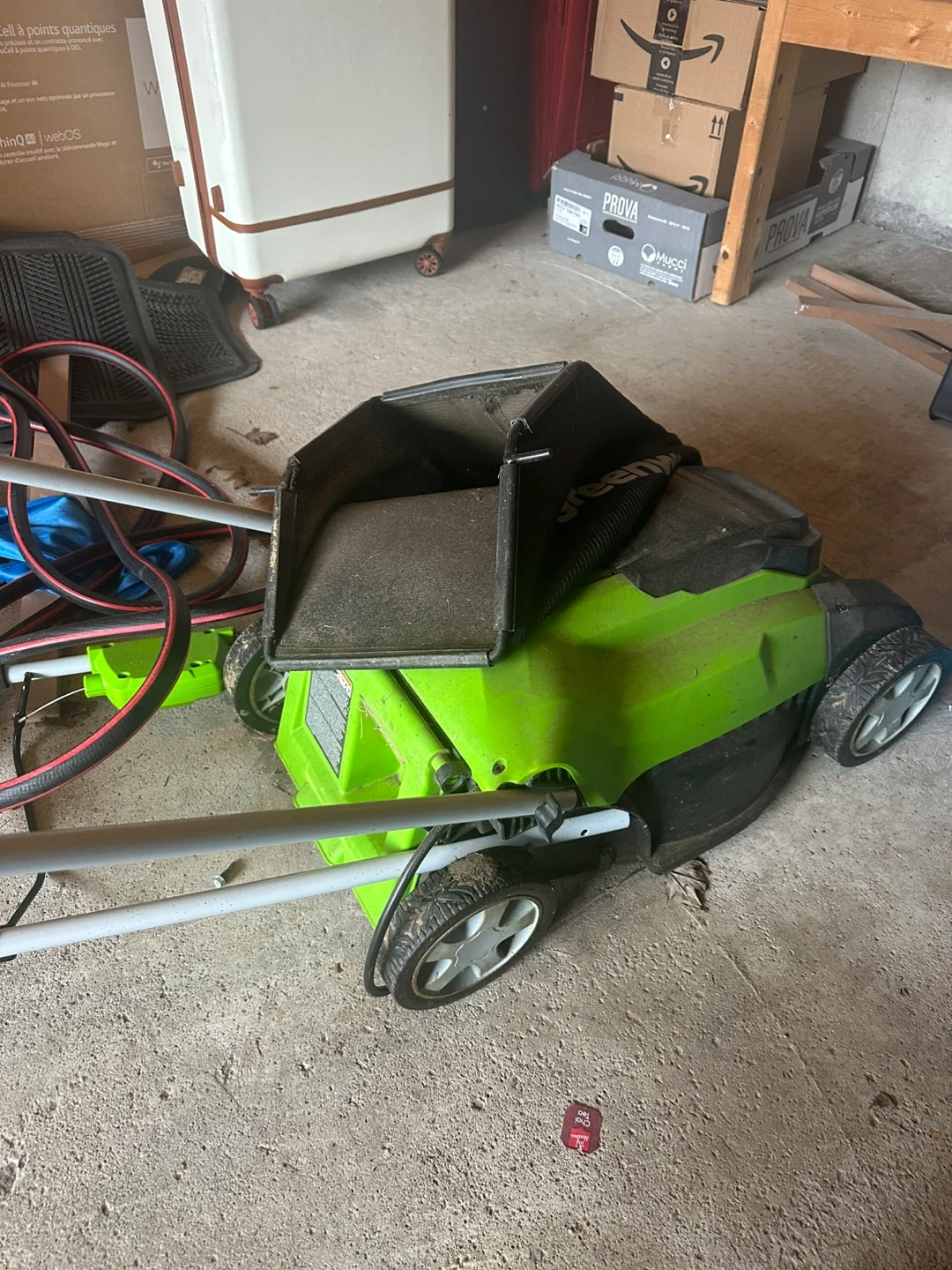 This Greenworks electric lawn mower is in good condition. It features a grass collection bag. It's a reliable choice for keeping your lawn tidy.