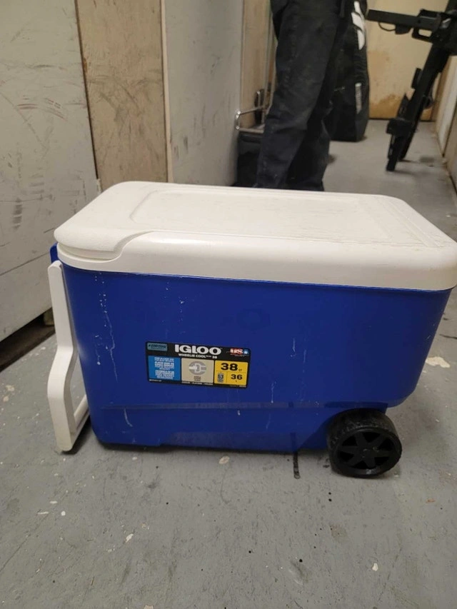 Keep your drinks and snacks cold with this Igloo wheeled cooler, offering 38 quarts (36 litres) of storage capacity, perfect for picnics, camping, or tailgating. This cooler has been used, but is still in good condition and ready to roll!